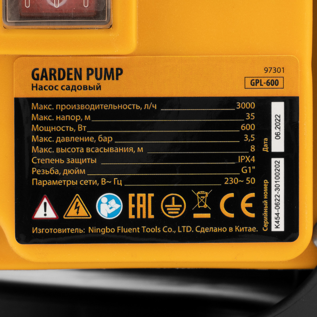 Садовый поверхностный насос GPL600, 600 Вт, 3000 л/ч, подъем 35 м, пластик Denzel