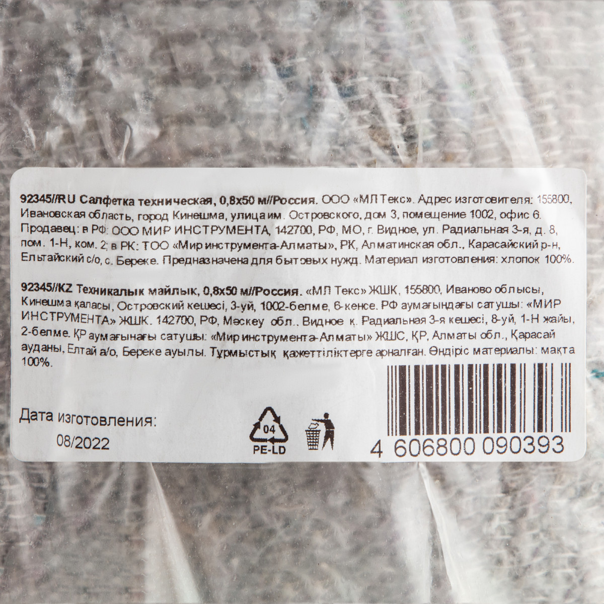 Салфетка техническая 92345 размером 0,8 х 50 м хорошо впитывает влагу и эффективно удаляет загрязнения. Подходит для использования во время строительно-монтажных работ, ремонта различных механизмов, изготовления стекол и зеркал, оптимальна для обтирания оргтехники, автомобильных деталей и поверхностей автотранспортных средств. Салфетка пригодится сотрудникам клининговых компаний для уборки помещений, а также в медицинской индустрии, общественных учреждениях и сфере общепита.
