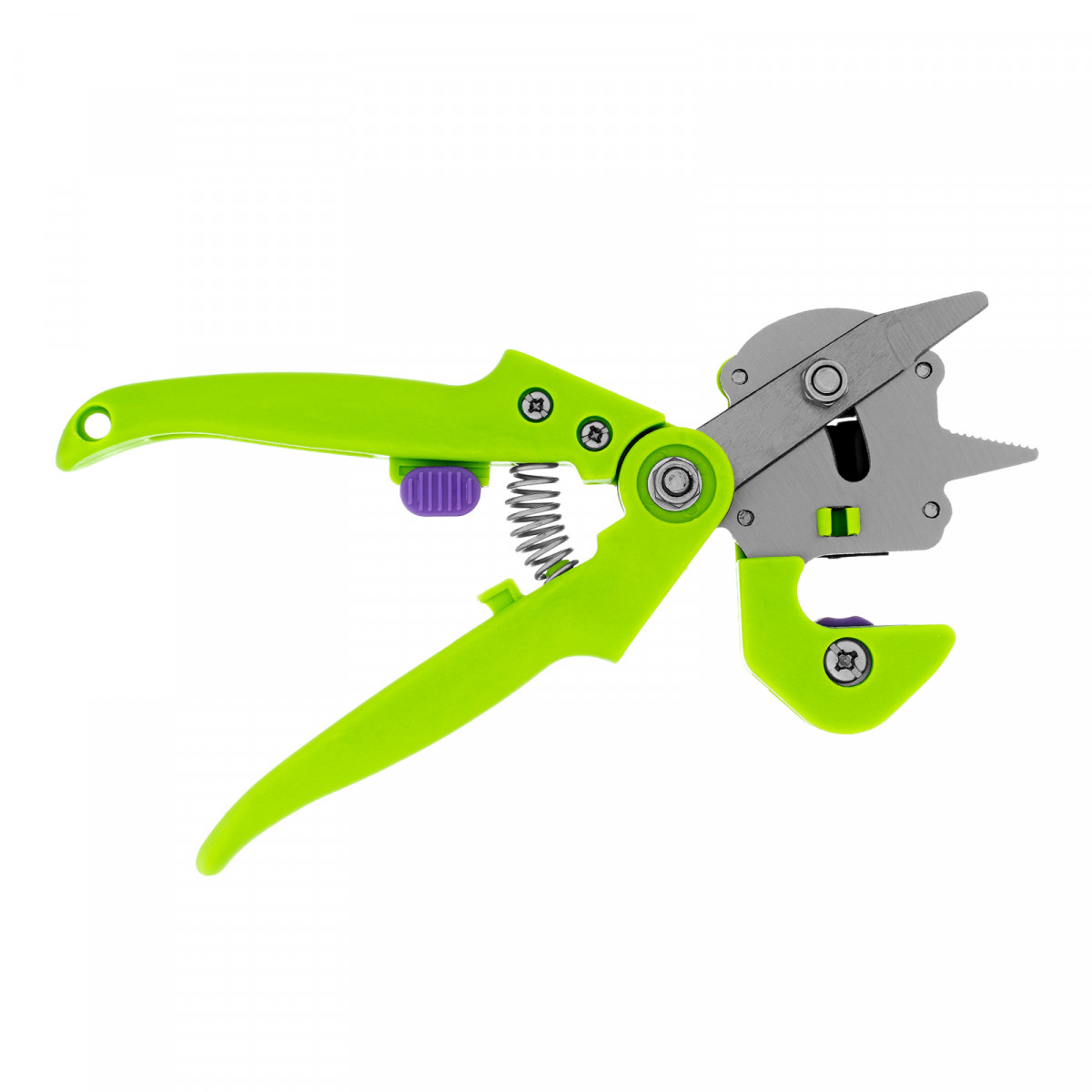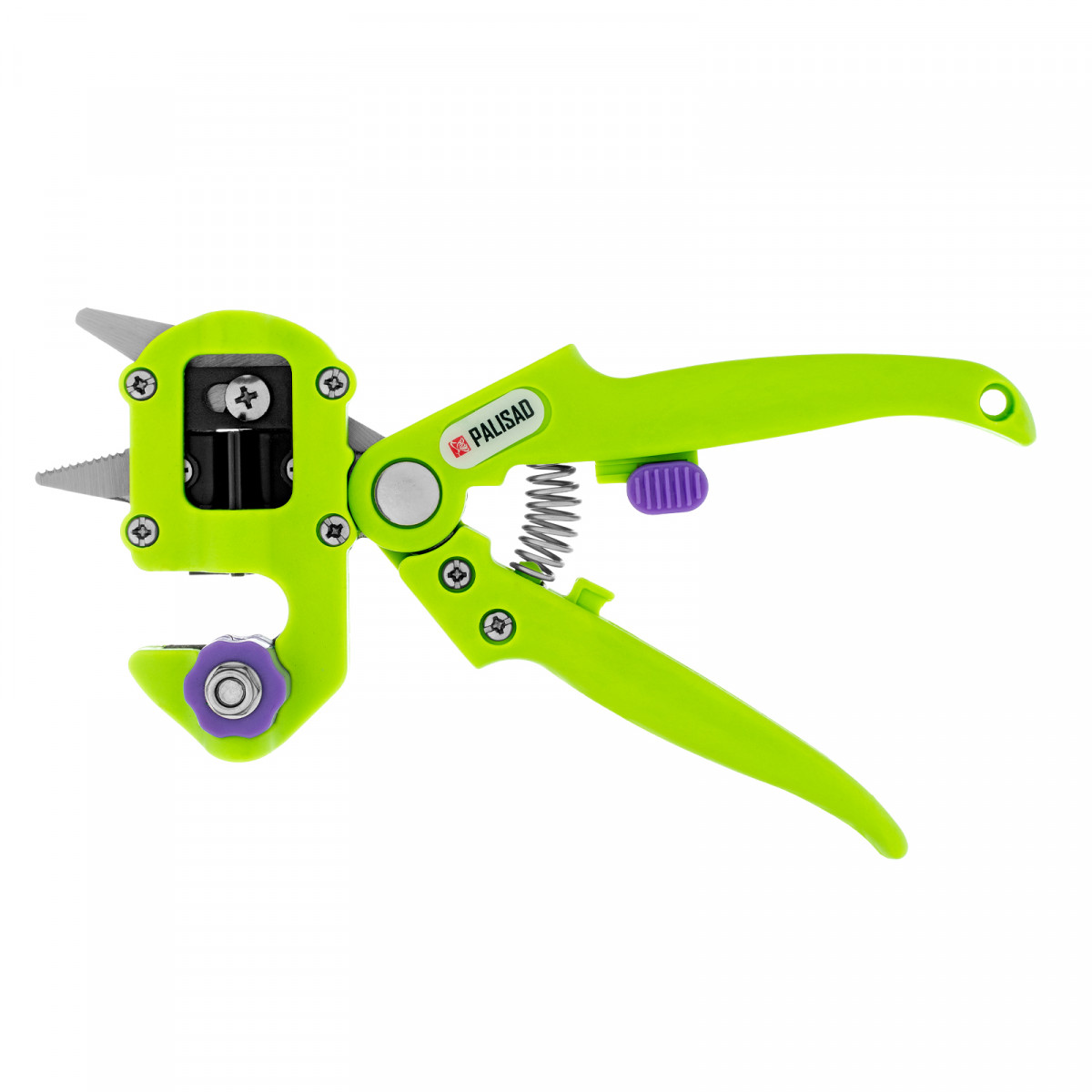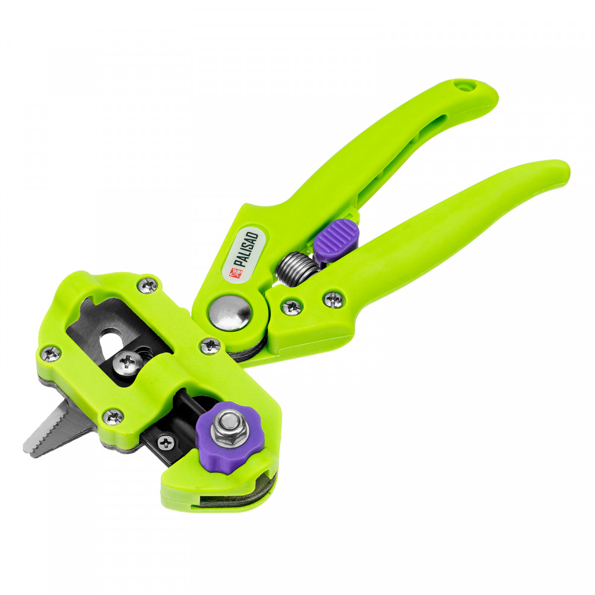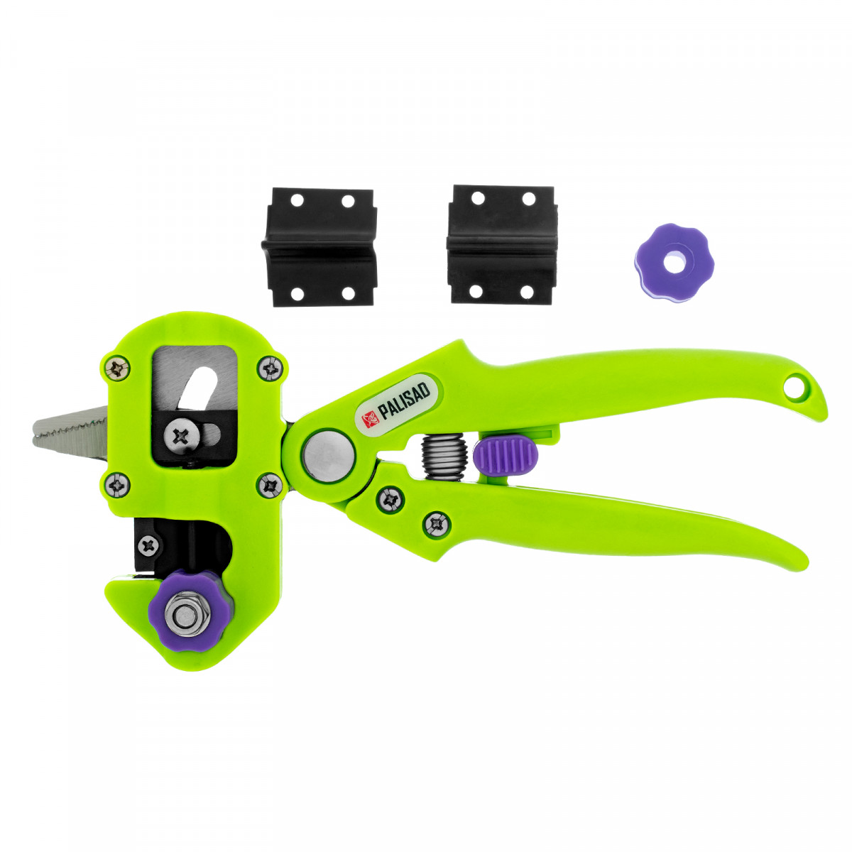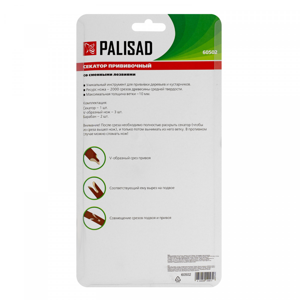 Прививочный секатор Palisad 60502 длиной 215 мм, со сменными ножами, используется для прививки плодовых растений черенком. Фигурные ножи секатора изготовлены из рессорно-пружинной стали, поэтому обладают высоким ресурсом (рассчитаны на 5000 срезов без дополнительной заточки). В комплекте U-образный, V-бразный и Ω-образный ножи, что позволяет работать с черенками различной толщины и плотности. Вырезы, сделанные на подвое и привое, идеально совместимы друг с другом, дополнительная подгонка им не требуется.
