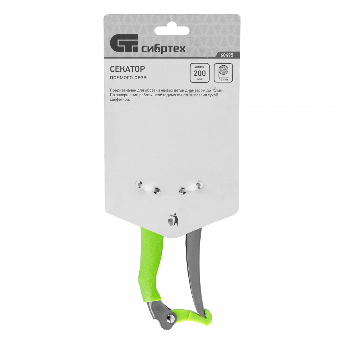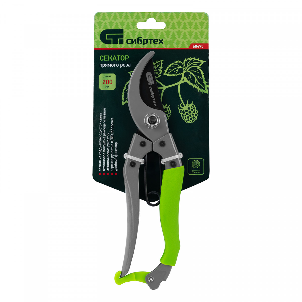 Секатор прямого реза Сибртех 60495 длиной 200 мм, с металлическим рукоятками, верхняя в ПВХ-оболочке, используется для ухода за садом и огородом. Предназначен для обрезания живых веток диаметром до 15 мм. Лезвие с прецизионной заточкой двигается в плоскости, параллельной опорному лезвию, чисто обрезая ветки и нанося минимальные повреждения растениям. Плотность примыкания лезвий регулируется — для этого предусмотрен винт.