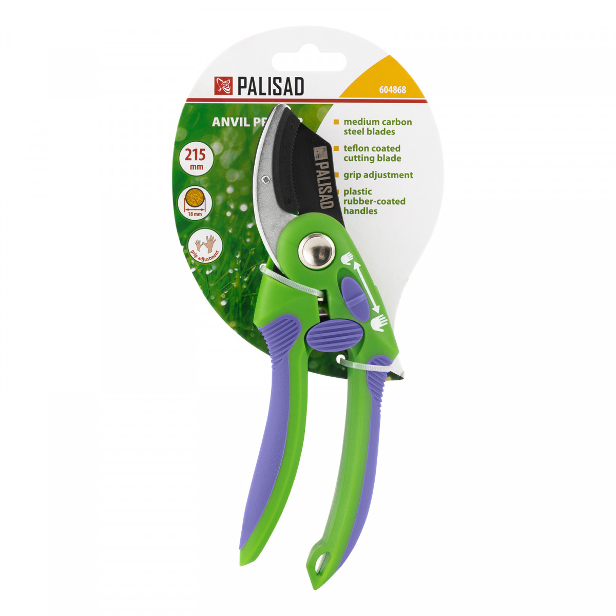 Секатор с наковальней Palisad длиной 215 мм, с двухкомпонентными рукоятками и регулировкой захвата, предназначен для срезания сухих и увядших веток диаметром до 18 мм. Выполнение этой задачи облегчает тефлоновое покрытие режущего лезвия. Благодаря опорной наковальне с зубчатой поверхностью садовый секатор успешно справляется даже с гладкими ветками. Вращая регулировочный винт, можно подогнать лезвия плотнее друг к другу. Инструмент будет полезен на дачном участке.