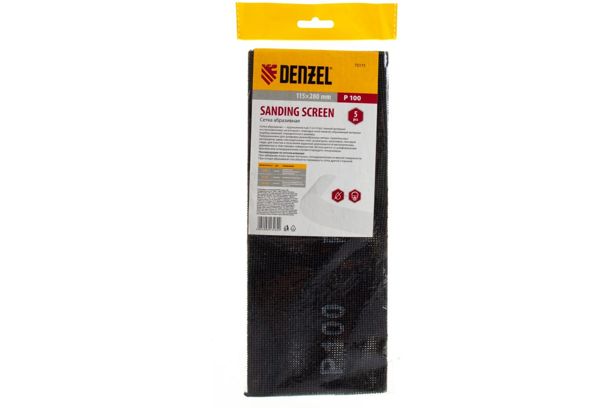 Абразивная сетка Denzel 75171, 115 х 280 мм, с зернистостью P 100, 5 шт. в упаковке, применяется для промежуточной шлифовки шпаклеванных поверхностей, а также твердой древесины и металла. Она эффективно удаляет верхний слой материала, ржавчину и лакокрасочные покрытия, сглаживает заусенцы. Частицы карбида кремния долго не стачиваются и обеспечивают высокий рабочий ресурс сетки. Она используется совместно с ручными шлифовальными приспособлениями — брусками и сеткодержателями соответствующего типоразмера.