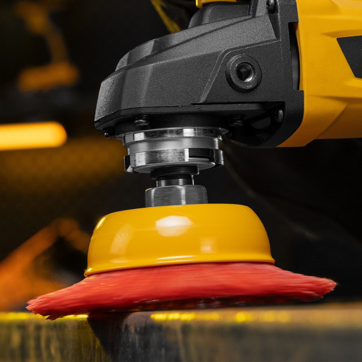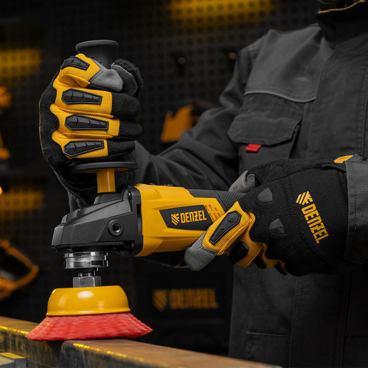 Щетка Denzel 74469 в форме чашки диаметром 100 мм, с нейлоновой щетиной, устанавливается на вал УШМ при помощи гайки М14. Предназначена для выполнения шлифовальных работ. Щетина изготовлена из высококачественного нейлона с нанесенным абразивом из оксида алюминия. удаления загрязнений, краски, пятен ржавчины с твердых поверхностей. Позволяет придать шероховатость поверхности, подходит для браширования древесины. Насадка удобна для обработки плоских деталей большой площади.