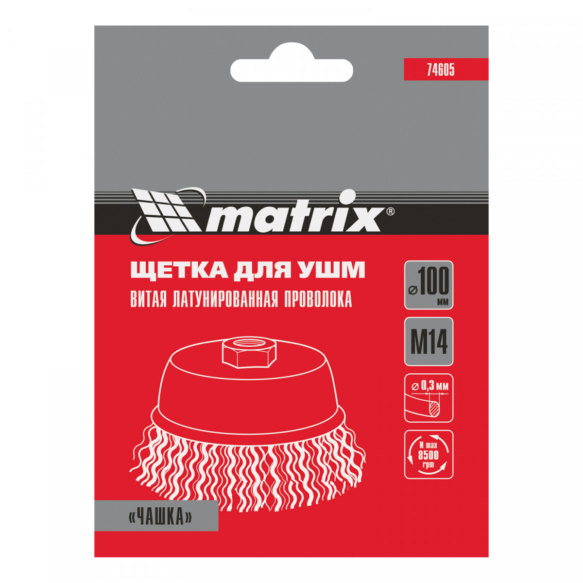 Щетка «чашка» Matrix 74605 диаметром 100 мм, с щетиной из латунированной витой проволоки, устанавливается на вал УШМ с помощью гайки М14. Предназначена для снятия тонкого слоя краски или лака, удаления ржавчины и загрязнений. При рекомендованной скорости вращения 8500 об/мин щеткой можно быстро обрабатывать участки большой площади.