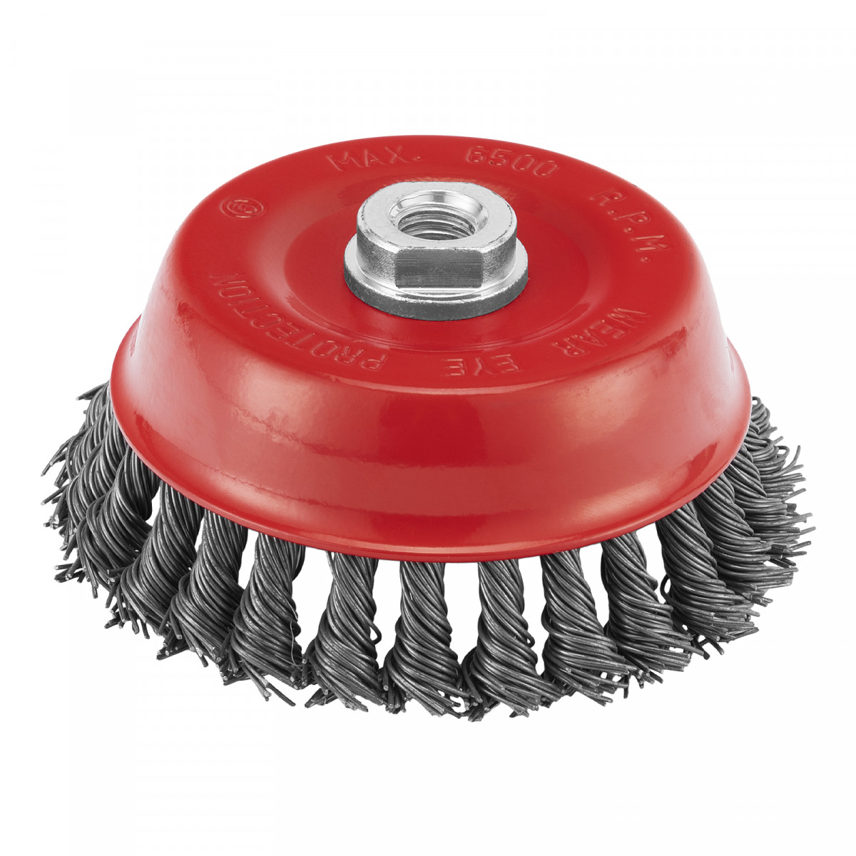 Щетка Matrix «Чашка» 74625 диаметром 125 мм, с присоединительной резьбой М14, с щетиной из крученой проволоки диаметром 0,8 мм, устанавливается на УШМ, поддерживающую работу со скоростью 6500 об/мин. Щетина предназначена для грубой (черновой) обработки поверхностей, более агрессивной по сравнению с щетиной 0,5 мм. Изделие подходит для удаления загрязнений, снятия толстого слоя ржавчины, ЛКМ, зачистки сварных швов.