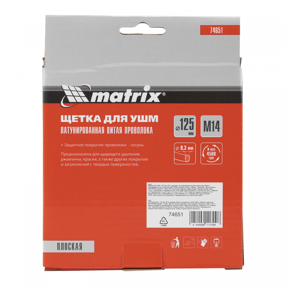 Плоская щетка Matrix 74651 диаметром 125 мм, с щетиной из латунированной витой проволоки, крепится к валу УШМ с помощью гайки М14. Используется для щадящей обработки поверхностей, снятия тонкого слоя ржавчины, лакокрасочных покрытий, удаления въевшихся загрязнений. Плоской щеткой удобно работать в труднодоступных местах: углах и изгибах. При эксплуатации на рекомендованной скорости 6500 об/мин оснастка прослужит долго.