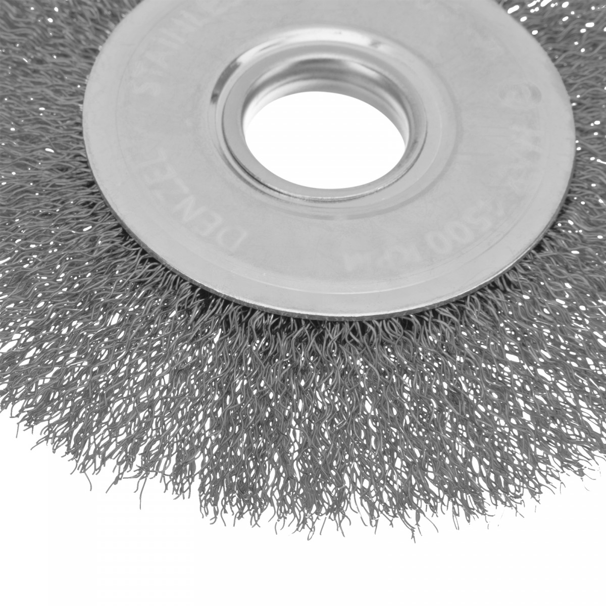 Щетка для УШМ, 125 мм, "Плоская", витая нержавеющая проволока 0.3 мм, посадка 22.2 мм Denzel