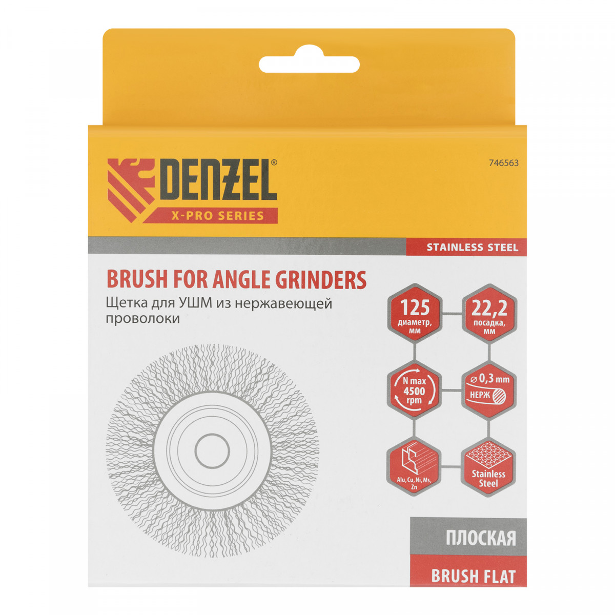 Плоская щетка для УШМ Denzel 746563 диаметром 125 мм, с щетиной из витой нержавеющей проволоки 0,3 мм, с посадкой 22,2 мм, постепенно снимает тонкий слой материала, поэтому ее используют для щадящей обработки металлических, деревянных, пластиковых поверхностей, а также изделий из нержавеющей стали. Щетка удаляет ржавчину, загрязнения, остатки лакокрасочных покрытий из труднодоступных мест, пазов и углов. Оснастка с посадкой 22,2 мм устанавливается на фланец углошлифовальной машины, что удобно для длительной работы без смены насадок. Рекомендуемая максимальная скорость вращения составляет 4500 об/мин. Во время работы следует использовать средства индивидуальной защиты. Щетку применяют в строительстве, машиностроении, а также в быту.