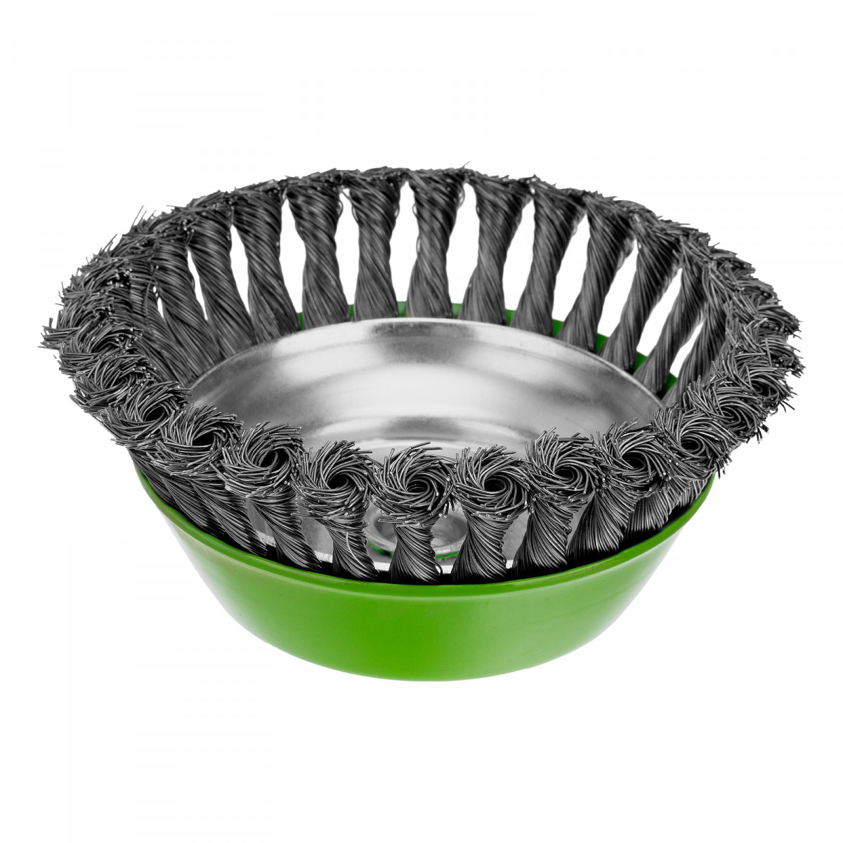 Щетка Сибртех «Чашка» 746297 диаметром 150 мм, с присоединительной резьбой М14, с щетиной из крученой проволоки диаметром 0,5 мм, устанавливается на УШМ, поддерживающую работу со скоростью 4500 об/мин. Изделие предназначено для грубой (черновой) обработки поверхностей и подходит для удаления загрязнений, снятия толстого слоя ржавчины, ЛКМ, зачистки сварных швов.