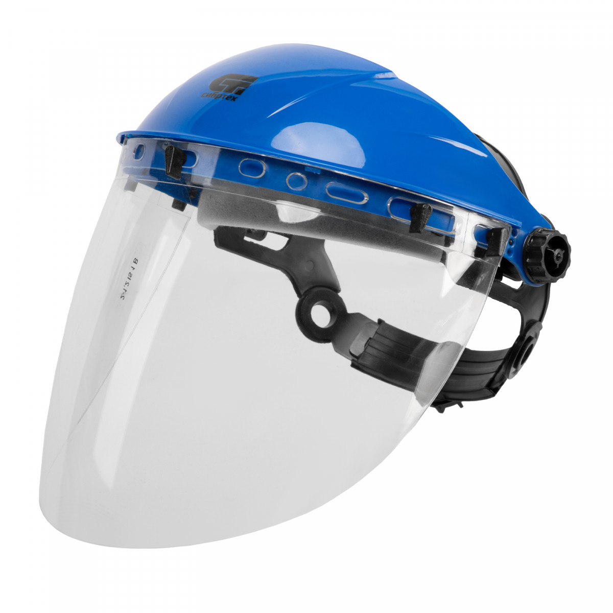 - Защита верхней части головы — щиток имеет козырек из противоударного термостойкого пластика.