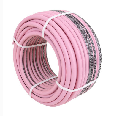 Шланг поливочный 3-х слойный розовый изготовлен из термоэластопласта. Этот материал сохраняет эластичность даже в экстремальный мороз (до -30°C). Рабочее давление 8 АТМ. Шланг обладает устойчивостью к скручиванию и перегибам.Шланг армирован полиэфирной нитью, плетение нити ромбовидное. Устойчив к воздействию УФ-излучения, не содержит фталатов и тяжелых металлов, идеально сопрягается со всеми изделиями для полива Жук.