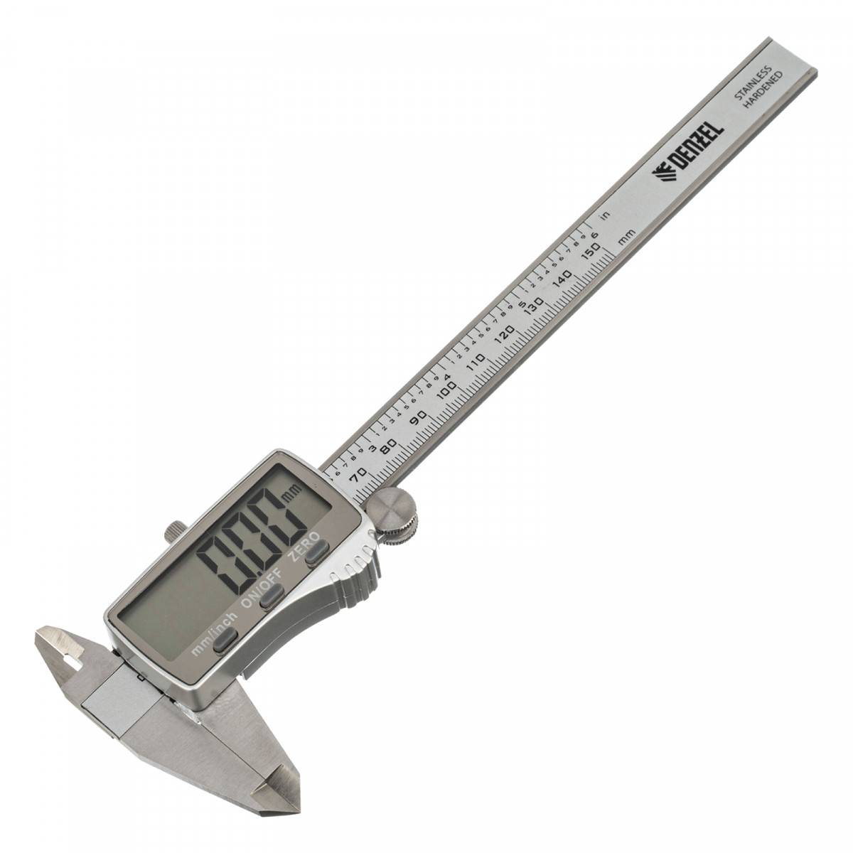 Электронный штангенциркуль Denzel 31614 со шкалой длиной 150 мм, с большим дисплеем и глубиномером, позволяет определять внутренние и внешние размеры различных деталей. Цена деления составляет 0,01 мм. Штангенциркуль позволяет получать результаты высокой точности: погрешность составляет ±0,02 мм при измерении размеров до 100 мм, и ±0,03 мм — до 150 мм. Двустороннее положение губок облегчает проведение работ. Инструмент пригодится на производстве, в мастерской, гараже, а также будет полезен в быту.