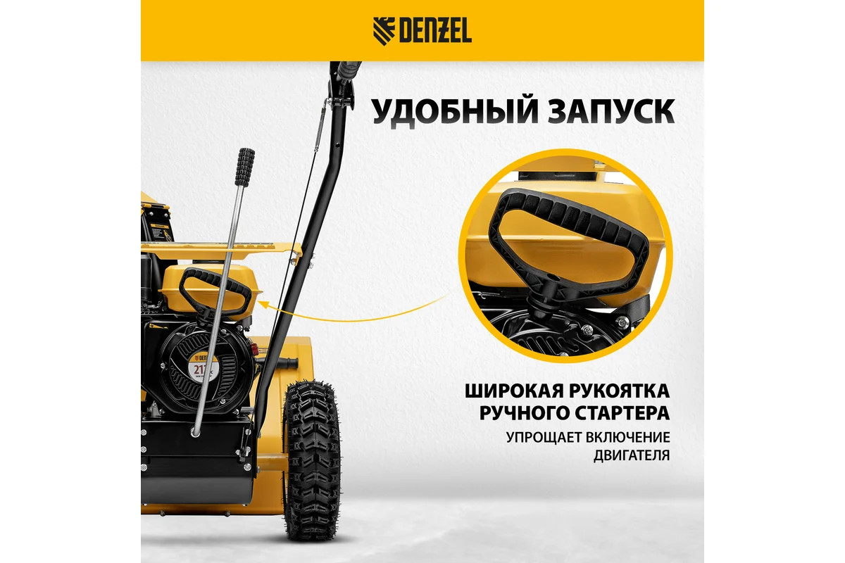 Благодаря ресурсному двигателю объемом 212 куб.см с высоким крутящим моментом снегоуборщик Denzel SB 560 эффективно убирает снег.
