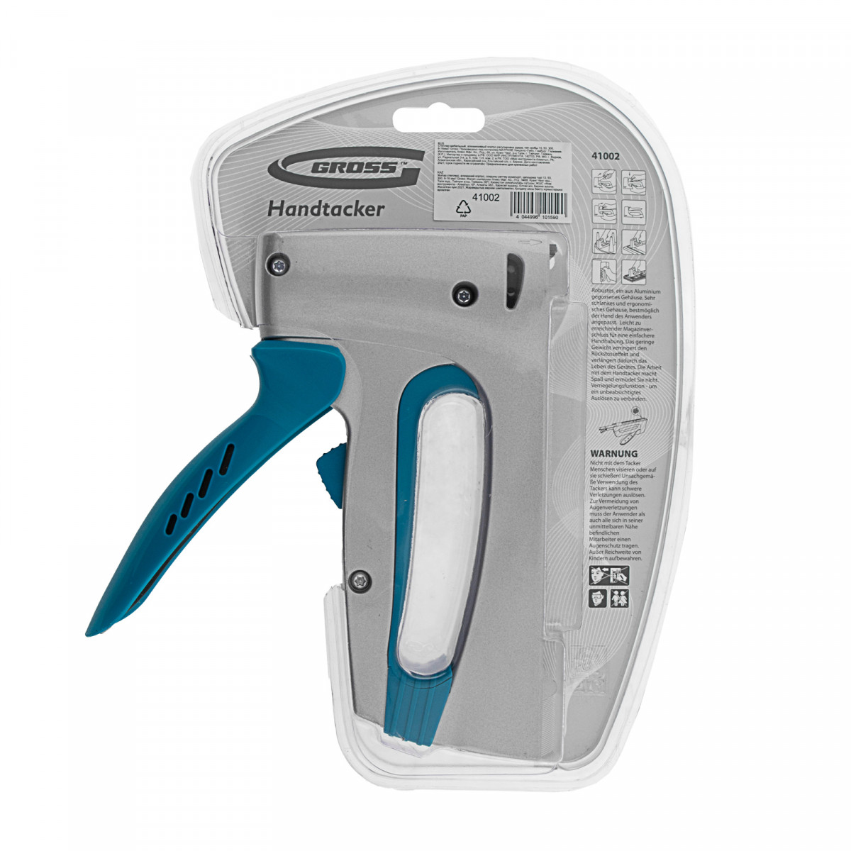 • Информативная упаковка — степлер поставляется в двойном блистере, позволяющем осмотреть его перед покупкой, а пиктограммы содержат необходимую техническую информацию.