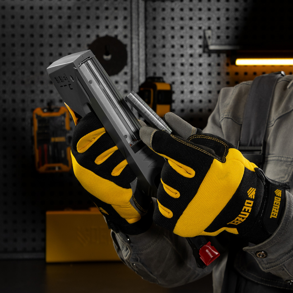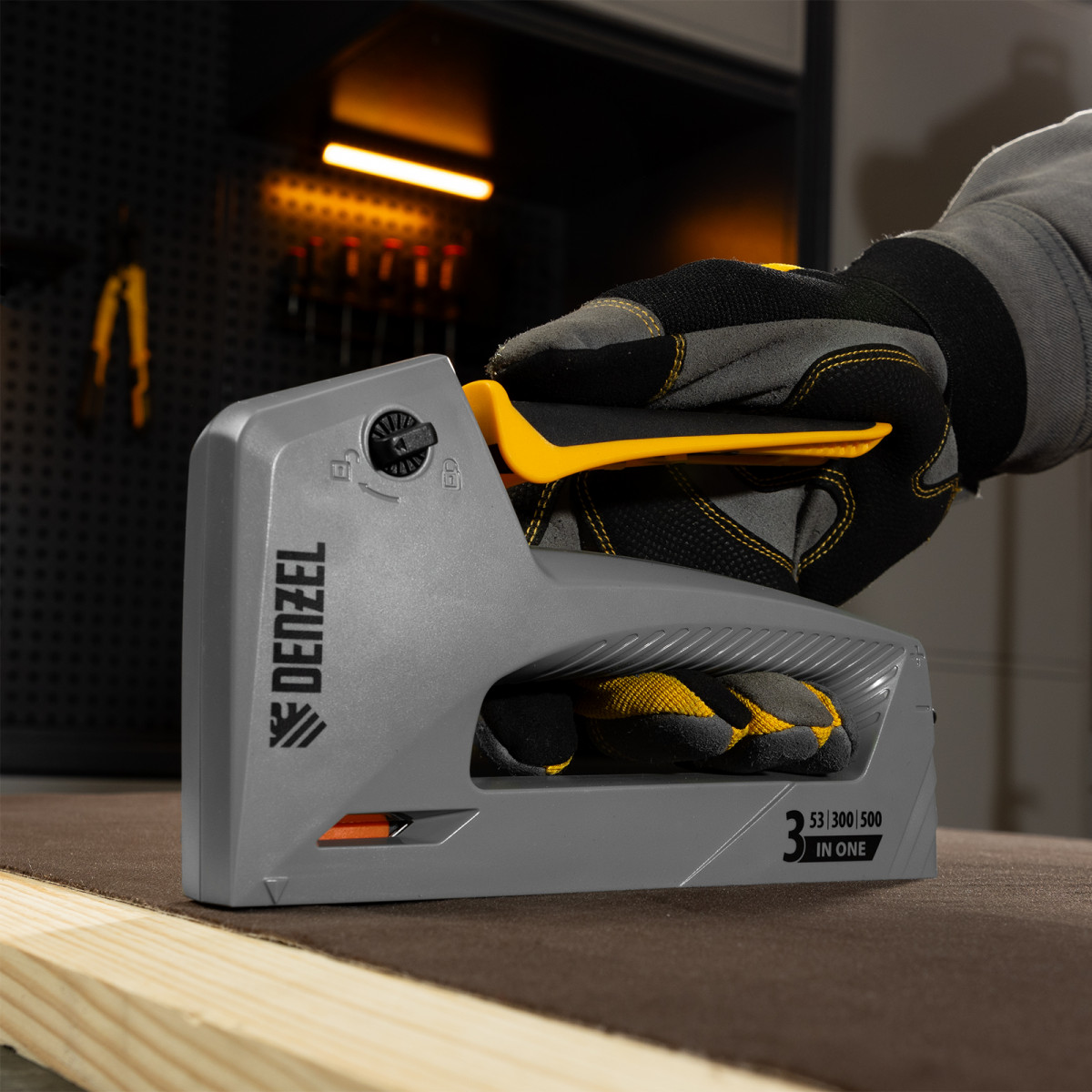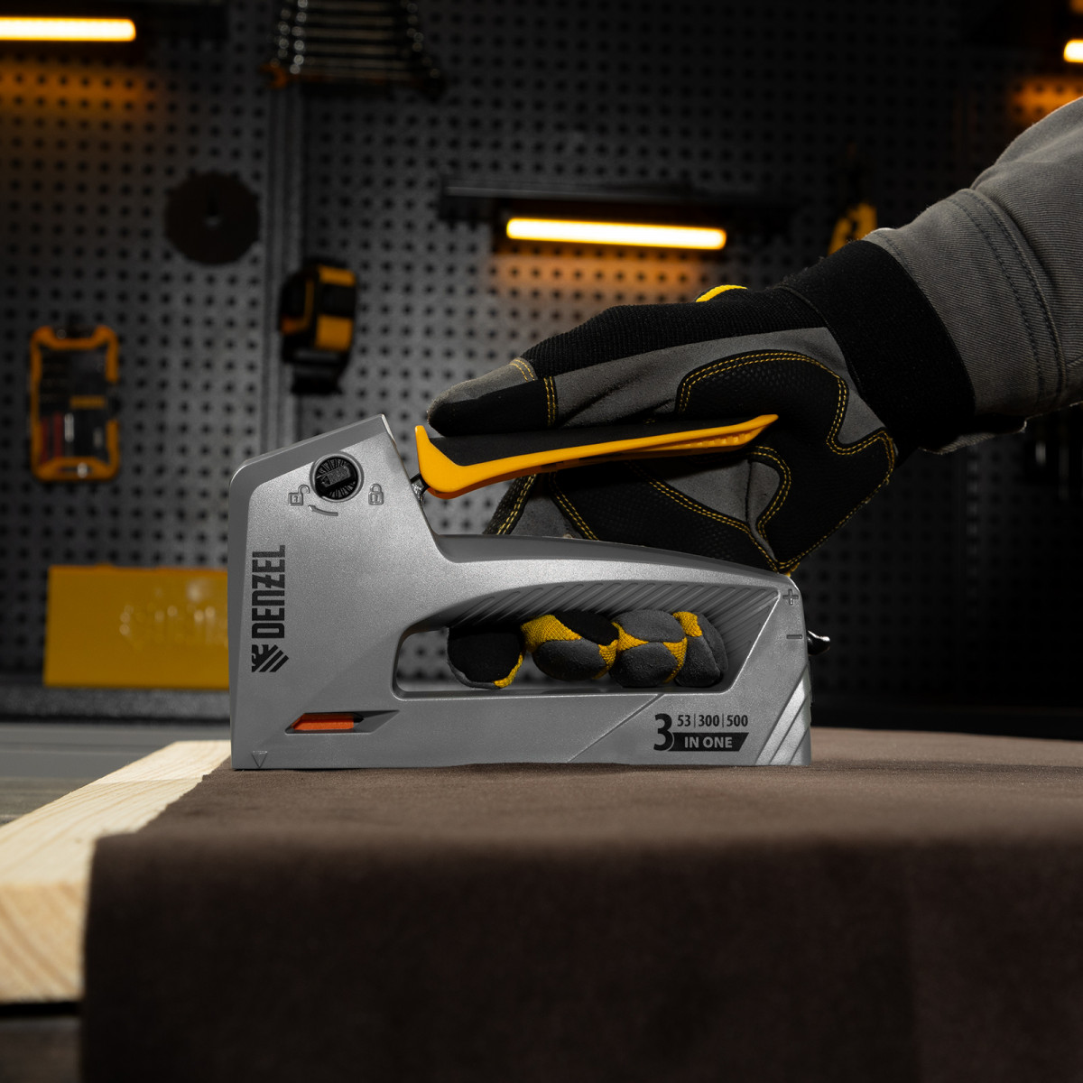 Мебельный степлер Denzel 40213 в пластиковом корпусе работает со скобами типа 53 размером 6-14 мм, а также гвоздями 300 и штифтами 500 длиной 15 мм. Используется для скрепления листовых материалов: фанеры, ДВП, ДСП, оргалита, а также для фиксации пленки и теплоизоляционного материала на деревянном основании. Эффективный ударный механизм позволяет на 30% снизить нагрузку на руку. Инструмент пригодится для обивки мебели, укладки напольных покрытий, выполнения ремонтных и багетных работ.