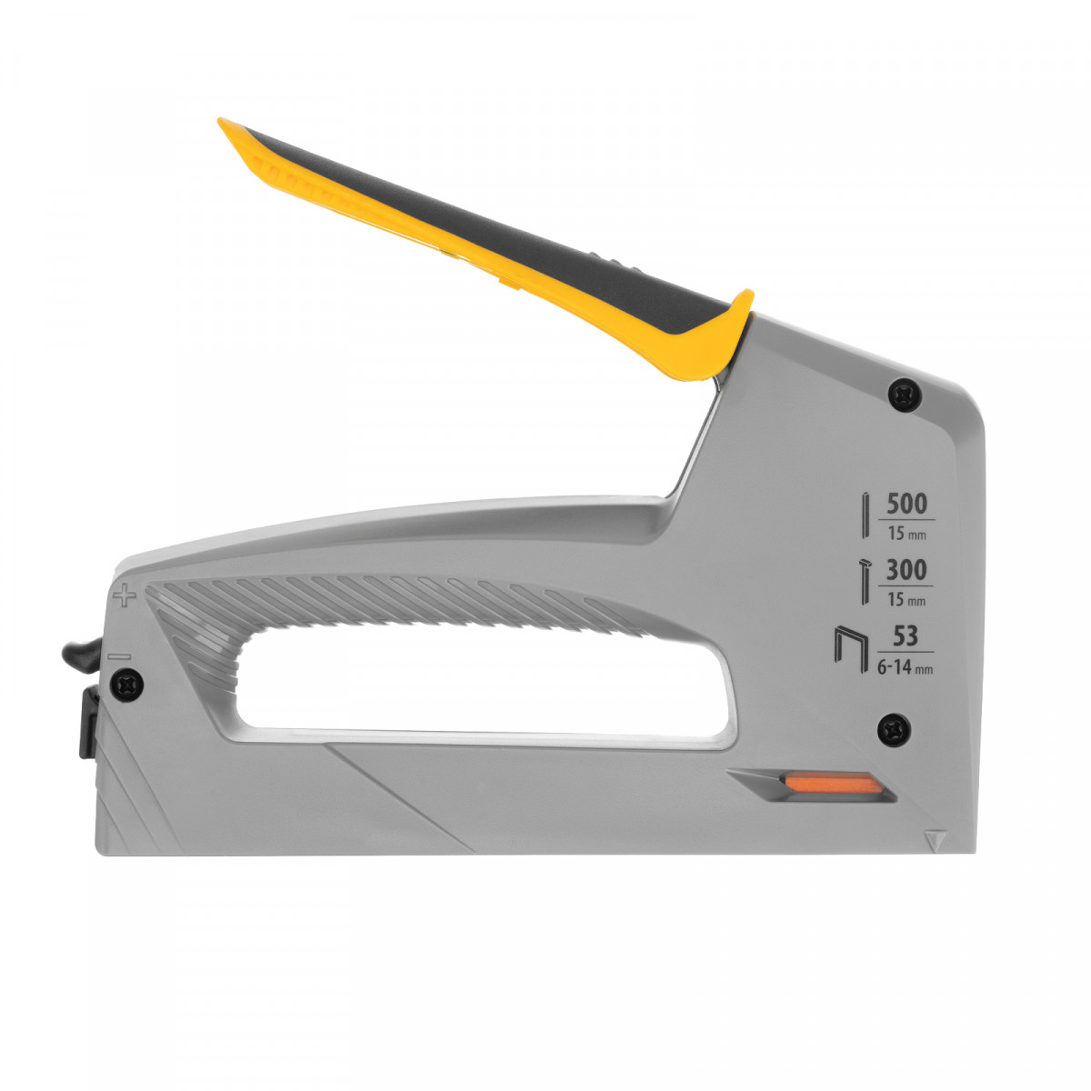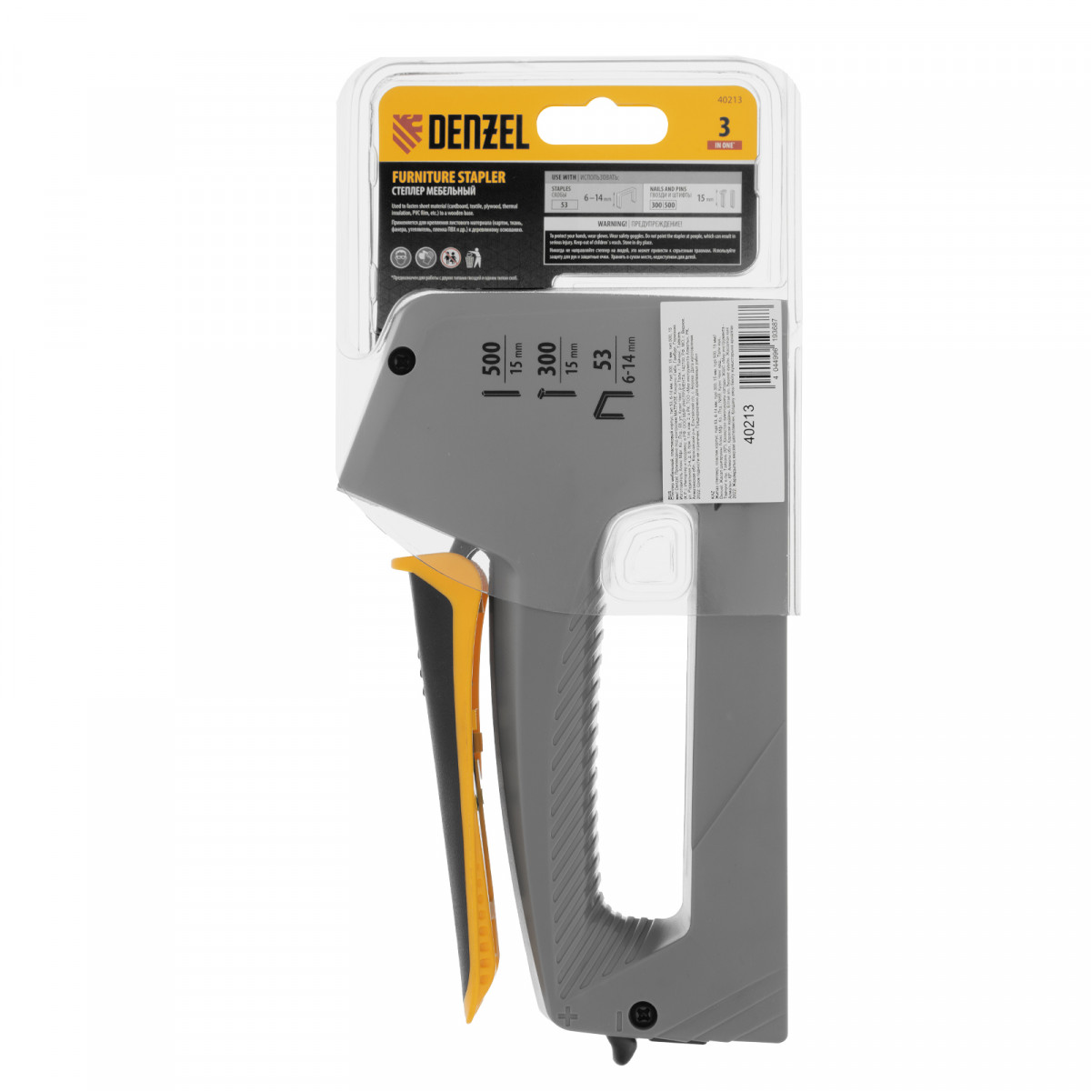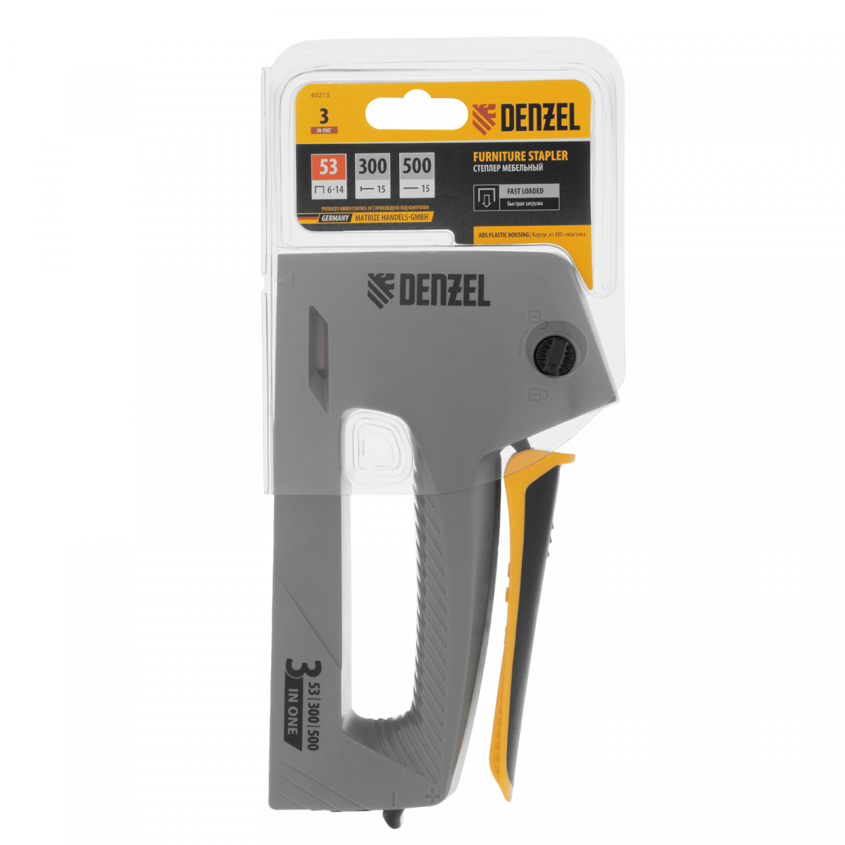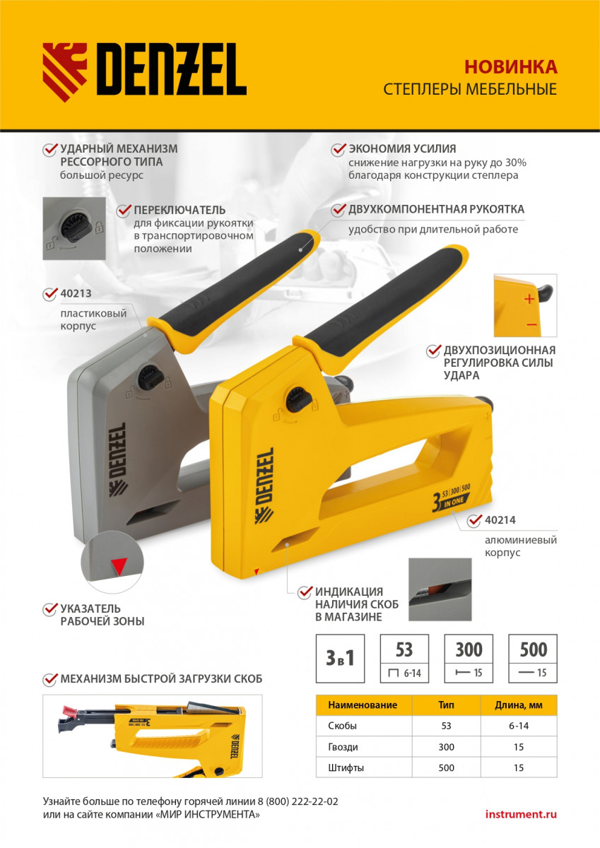 Степлер мебельный, пластиковый корпус, тип 53, 6-14 мм, тип 300, 15 мм, тип 500, 15 мм Denzel