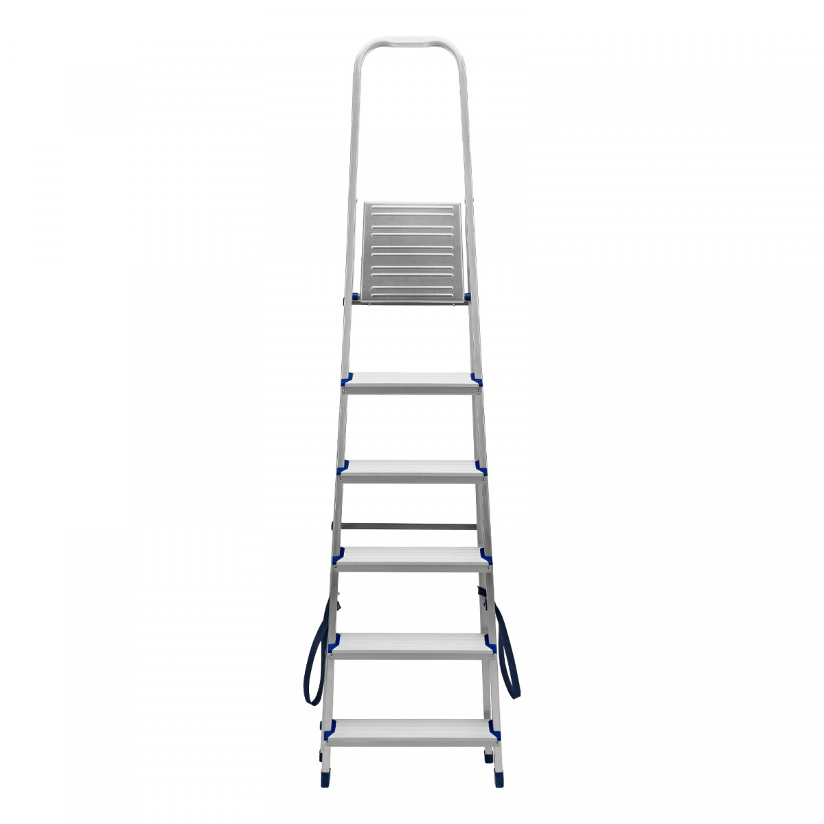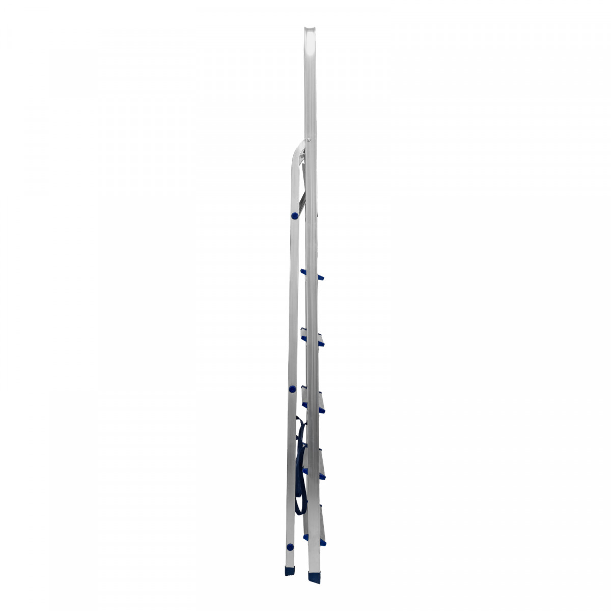 • Надежность — рама из прямоугольного алюминиевого профиля выдерживает нагрузку до 150 кг, широкие ступени закреплены заклепками, страховочные стяжки повышают прочность конструкции.