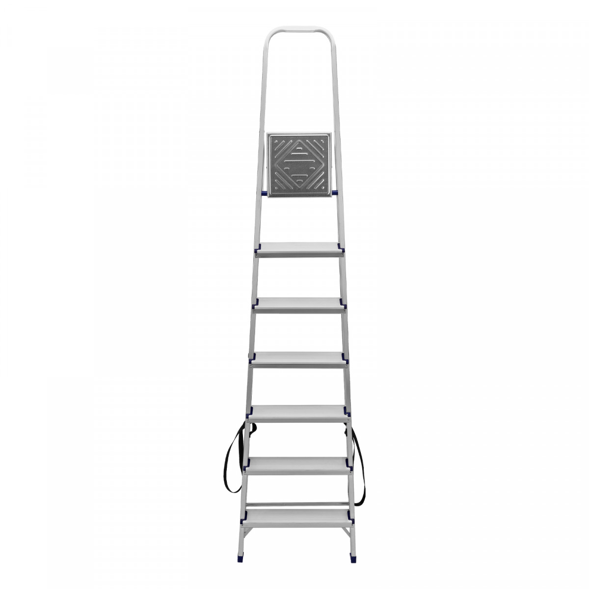 - Надежность — рама из прямоугольного алюминиевого профиля выдерживает нагрузку до 150 кг, широкие ступени закреплены заклепками, страховочные стяжки повышают прочность конструкции.