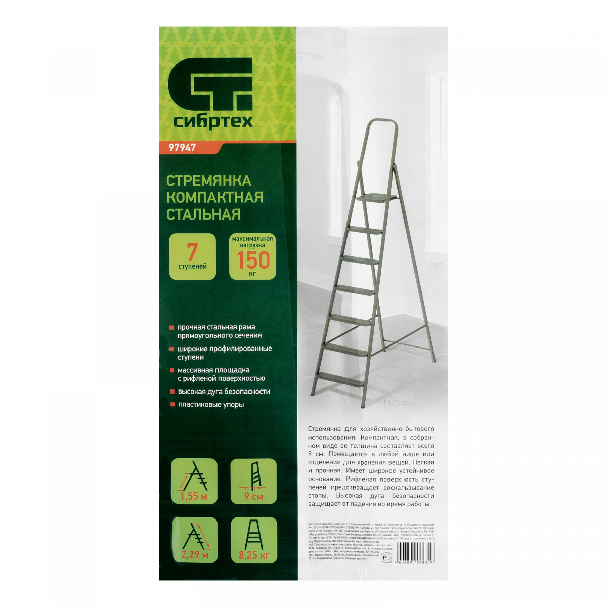 Стремянка компактная стальная Сибртех 97947 с 7 ступенями служит для проведения работ на высоте, превышающей человеческий рост. Стальные профилированные рама и ступени рассчитаны на нагрузку до 150 кг. Площадка находится на высоте 156 см от опорной поверхности, рабочая высота стремянки составляет 356 см (при среднем росте пользователя 170 см). Использовать стремянку можно дома, на даче или в гараже, а также во время строительства и ремонта.