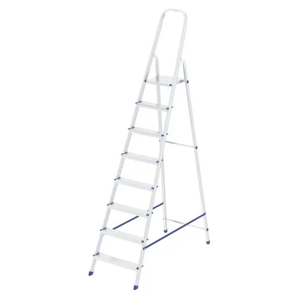 Стремянка предназначена для бытового применения и подходит для выполнения внутренних и наружных работ. Конструкция включает 8 ступеней с рифлением (без покрытия) размерами 8 × 40 см, которые закреплены с помощью заклепок. Стремянка способна выдерживать нагрузку до 150 кг.