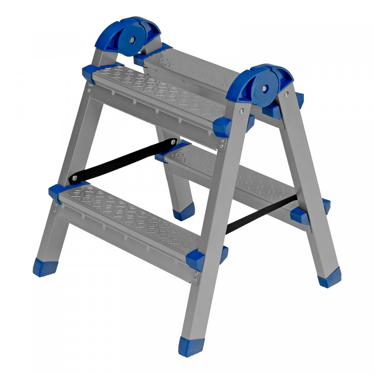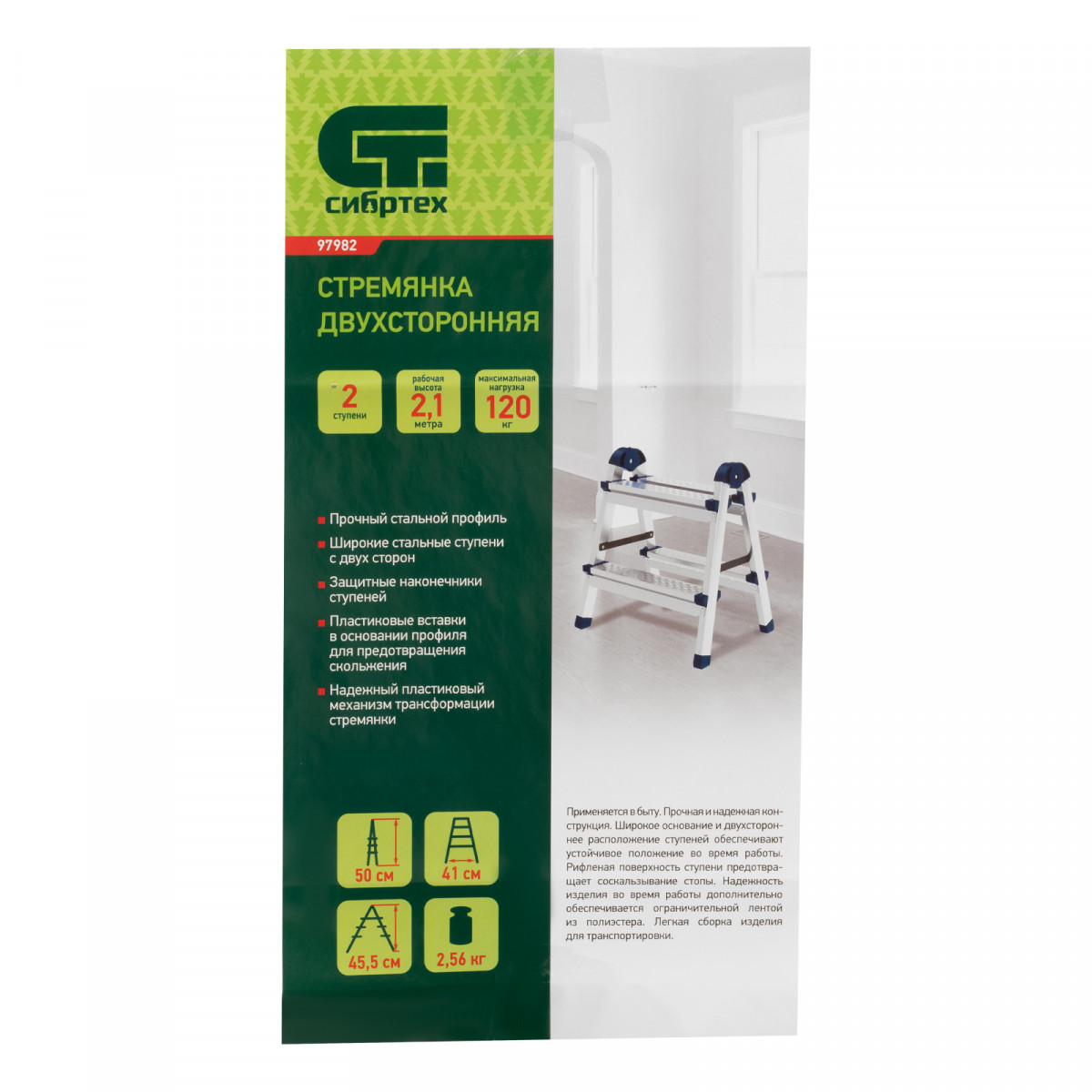Стремянка двухсторонняя Сибртех 97982 со стальным профилем и 2 стальными ступенями помогает решать бытовые задачи на высоте, превышающей человеческий рост. Ее используют, чтобы доставать предметы с антресолей или шкафов, проводить уборку, менять лампочки, вешать полки или картины. Работать с электроинструментом на ней не рекомендуется. Стремянка с пластиковым складным механизмом повышенной стабильности и широким основанием очень устойчива на ровной поверхности. Площадка находится на высоте 44 см от опорной поверхности, рабочая высота стремянки составляет 244 см (при среднем росте пользователя 170 см).