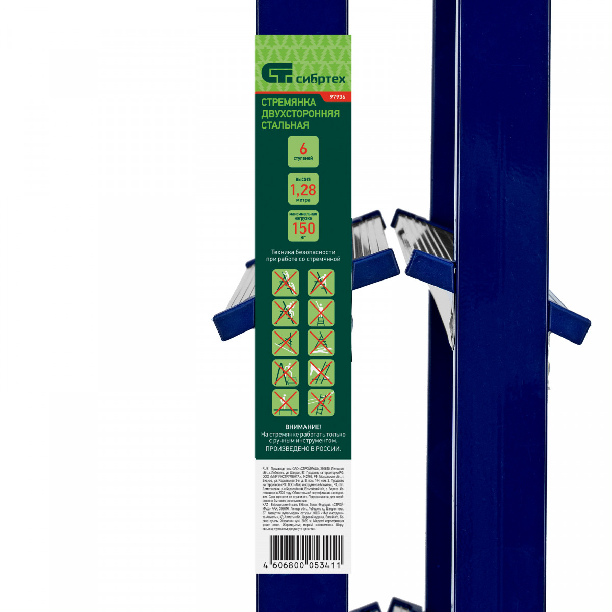 Стремянка двусторонняя стальная Сибртех 97936 с 6 ступенями используется строителями, работниками коммунальных служб, а также полезна в быту. Незаменима, если нужно выполнить монтажные или отделочные работы на высоте, провести уборку, а также достать нужные предметы с антресолей или верхней полки шкафа. На широких ступенях комфортно стоять. Площадка находится на высоте 125,3 см от опорной поверхности, рабочая высота стремянки составляет 325,3 см (при среднем росте пользователя 170 см). Стальная рама прямоугольного сечения выдерживает нагрузку до 150 кг.