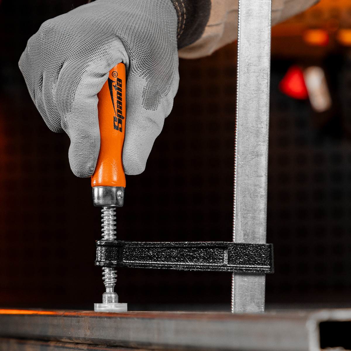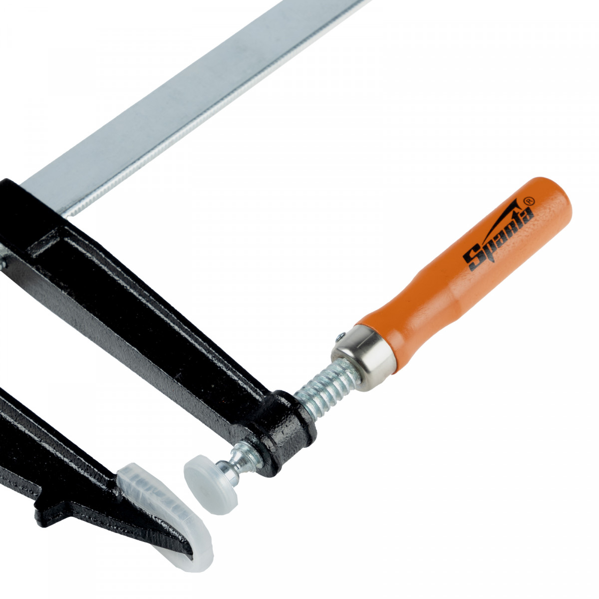 F-образная струбцина Sparta 204385 длиной 365 мм и величиной зажима 300 х 120 мм позволяет фиксировать заготовки из металла, древесины и других материалов для их соединения или обработки. Используется в столярном и слесарном деле. Деталь помещают между губками, одна из которых подвижна и служит для регулировки величины захвата. Винтовой зажим позволяет фиксировать заготовку со значительным усилием. Элементы конструкции выдерживают высокую температуру, поэтому струбцина подходит для проведения сварочных работ, при этом пластиковые накладки необходимо снять.