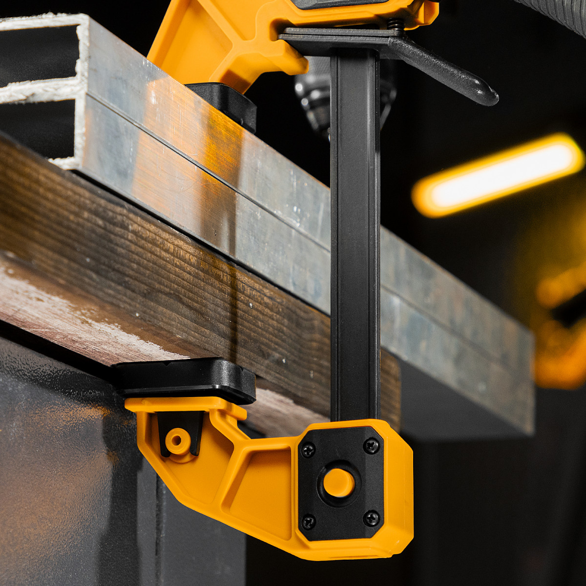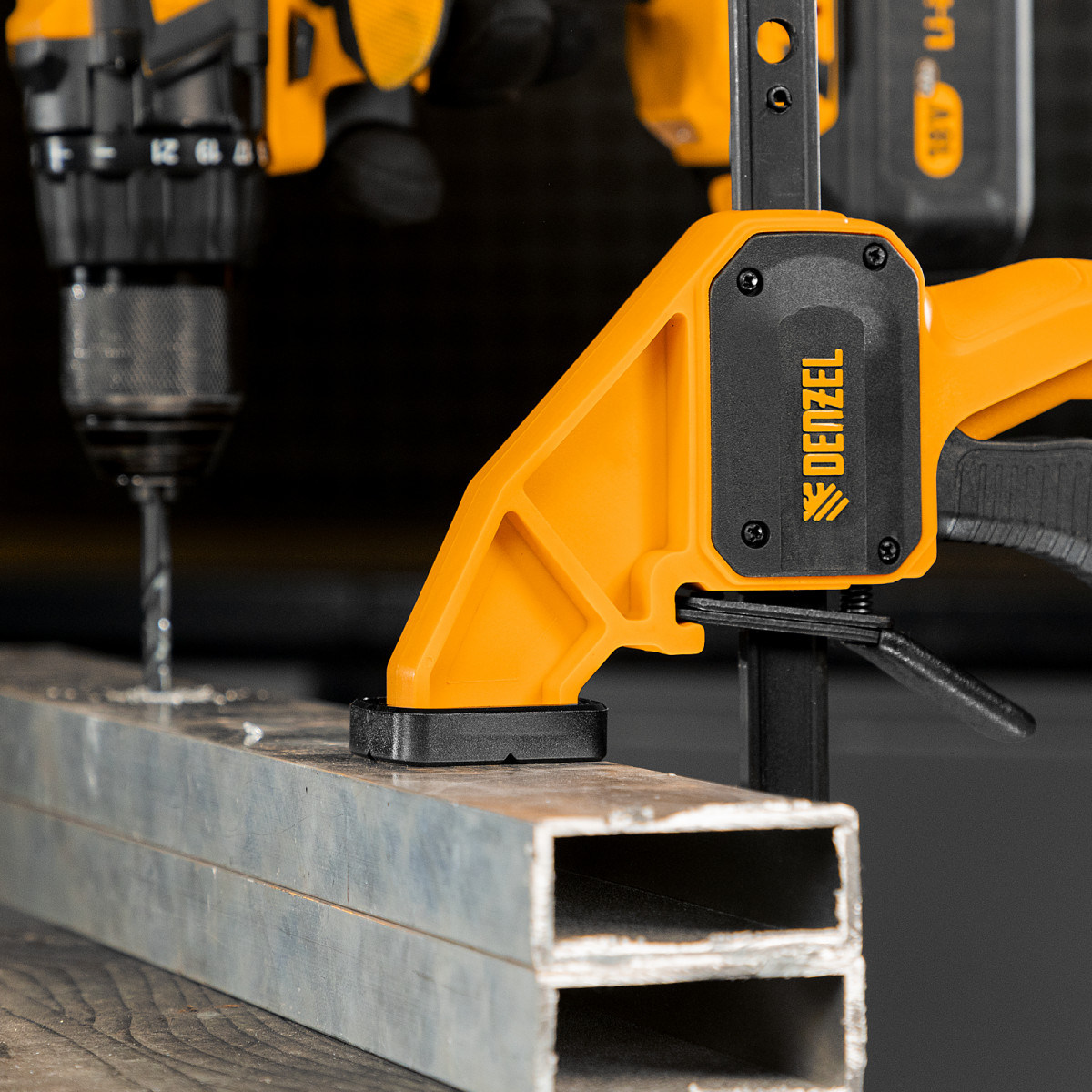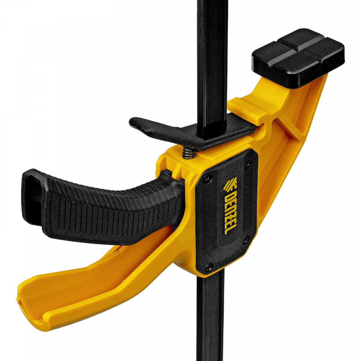 • Комфортное использование — струбцина весит всего 560 г, обрезиненная кнопка фиксации обеспечивает удобный захват.
