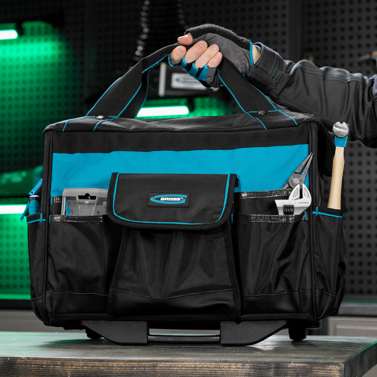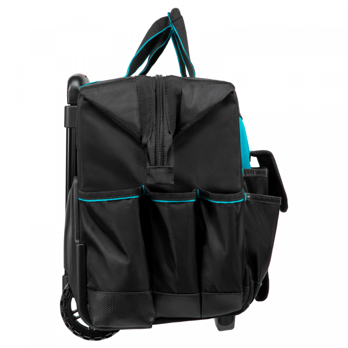 • Мобильность — сумку с инструментами легко перемещать при помощи колес и телескопической рукоятки.