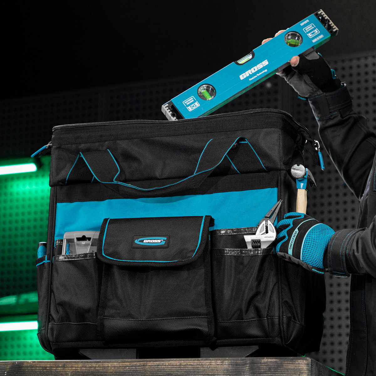 Сумка Gross 90277 размером 460 х 240 х 340 мм, с выдвижной рукояткой и колесами, имеет 18 карманов и вместительное основное отделение, в которые можно сложить необходимый ручной и электроинструмент. Сумка пригодится дома, в гараже и в поездке.