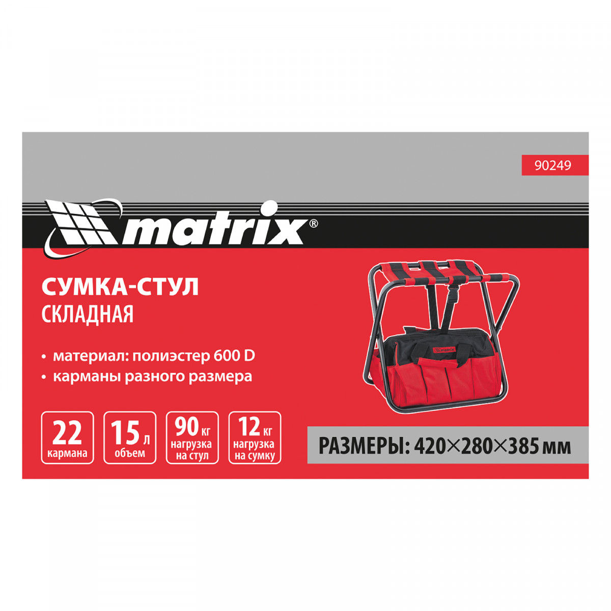 Складная сумка-стул Matrix 90249 размером 420 х 280 х 385 мм позволяет хранить и переносить инструменты и снаряжение, а также всегда иметь при себе удобный предмет рабочей или туристической мебели. Установить его можно за несколько секунд. Сумка-стул пригодится во время пикника и рыбалки, а также облегчит работу в саду и огороде.