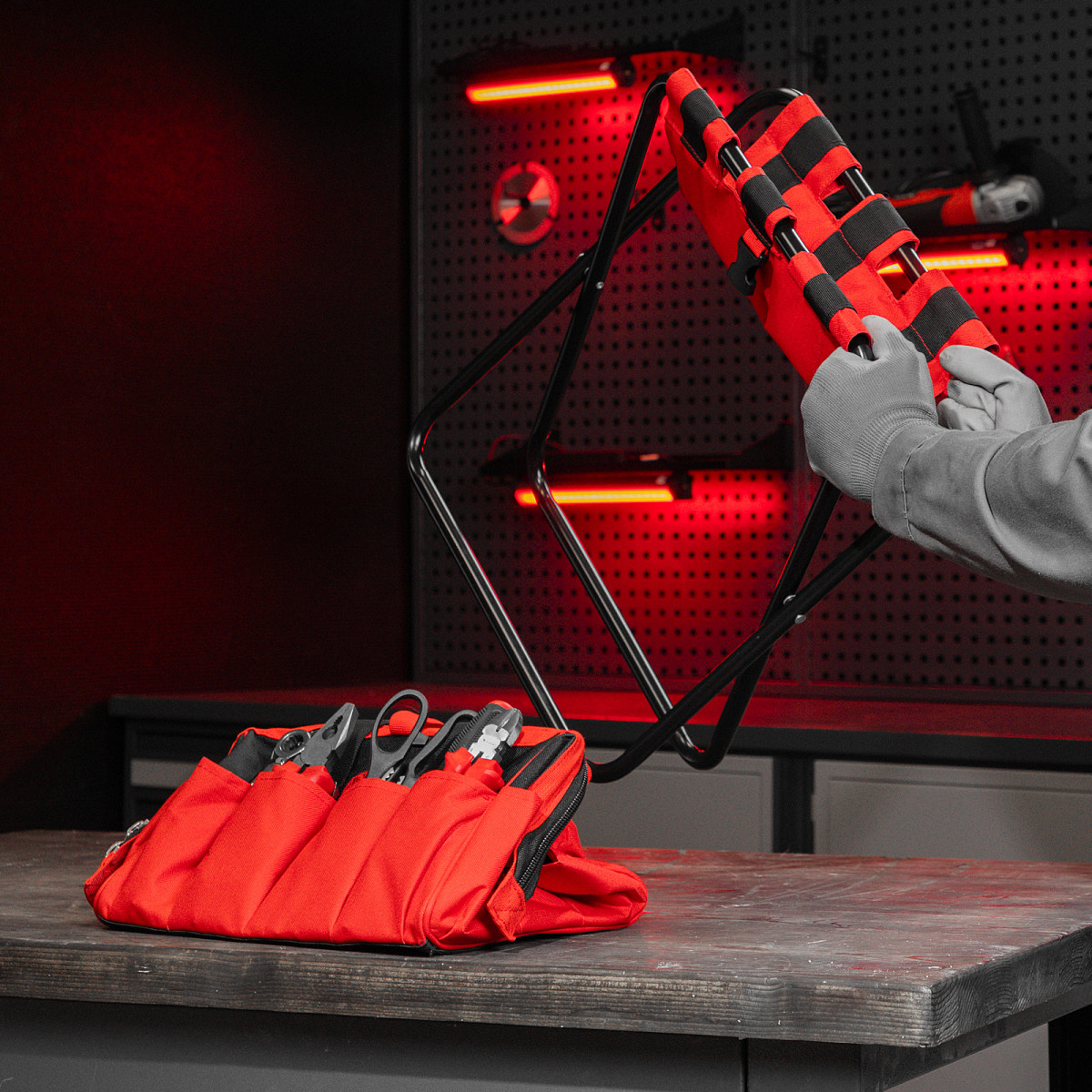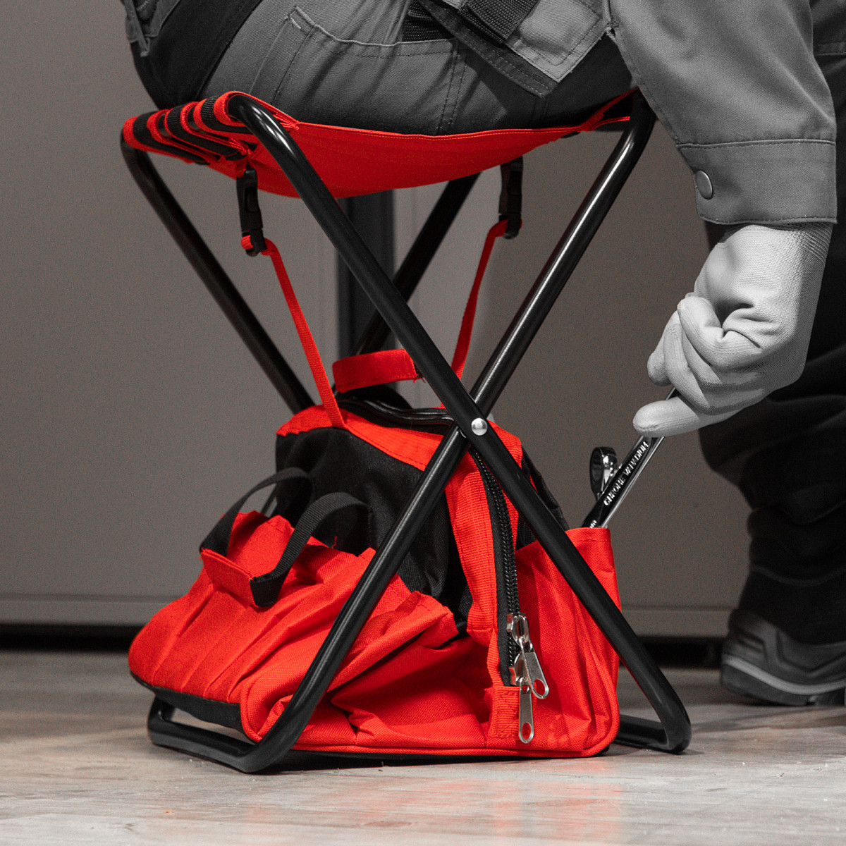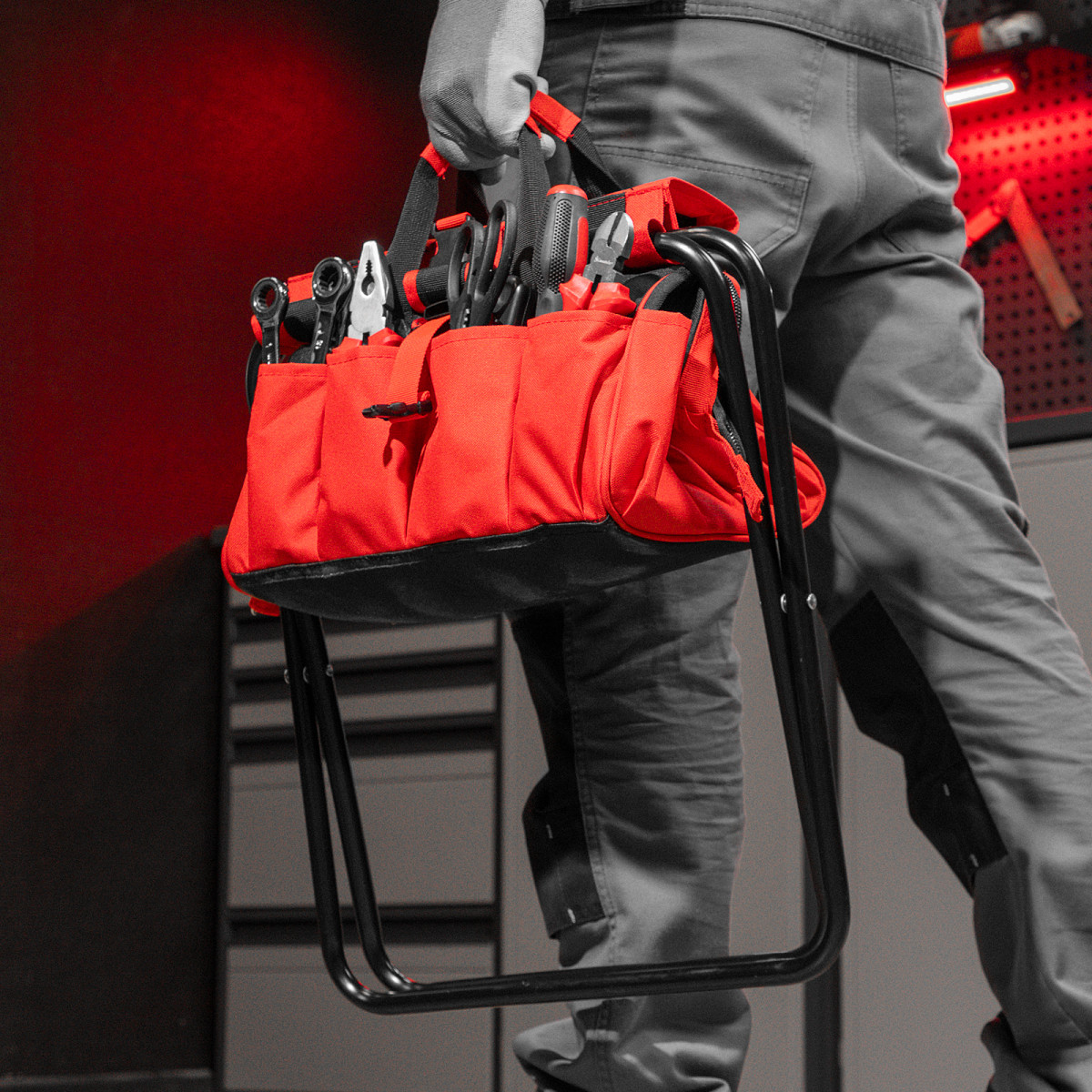 • Многофункциональность — складной стул комплектуется сумкой с вместительным основным отделением и большим количеством карманов, в которых поместятся все необходимые инструменты.