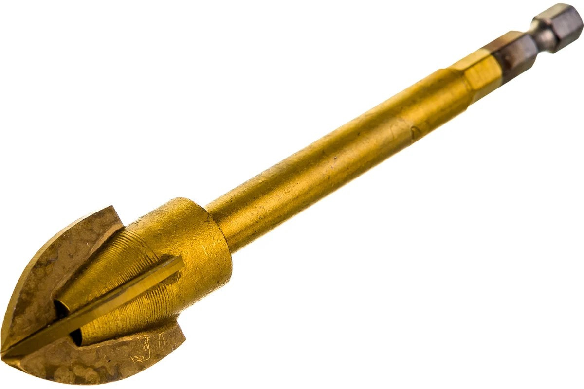 Сверло предназначено для сверления кафельной плитки, керамики, мрамора, стекла и даже керамогранита. Корпус сверла выполнен из инструментальной стали, 4 режущие кромки из твердого сплава. Титановое покрытие сверла обеспечивает дополнительную защиту от перегрева сверла в работе. Хвостовик HEX (шестигранный) под быстросъемный патрон. При работе рекомендуется использовать охлаждающую жидкость для более качественного сверления и долгой службы сверла, применять в безударном режиме.