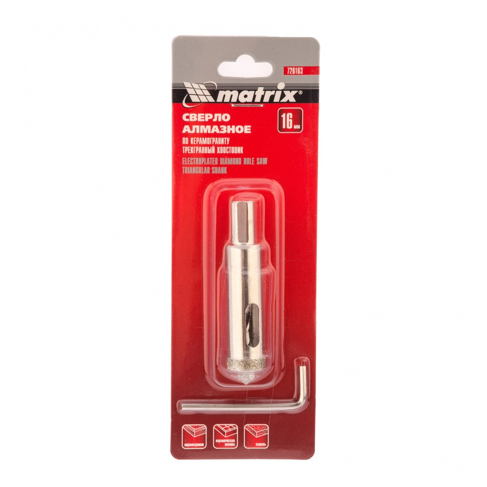 Сверло алмазное по керамограниту, 16 х 67 мм, трехгранный хвостовик Matrix
