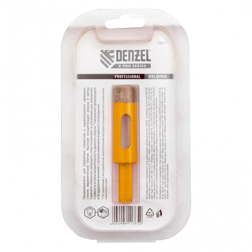 Алмазное сверло Denzel 72677 с трехгранным хвостовиком, для «мокрой» резки, — режущий инструмент для получения точных отверстий диаметром 16 мм. Подходит для работ по стеклу, керамике, а также керамограниту и мрамору. Используется в качестве оснастки для дрелей и шуруповертов. Сверление с применением водяного охлаждения позволит избежать перегрева сверла и продлить срок его службы. Использование кондуктора 72830 препятствует смещению коронки и облегчает засверливание. Оснастка предназначена для профессионального использования.