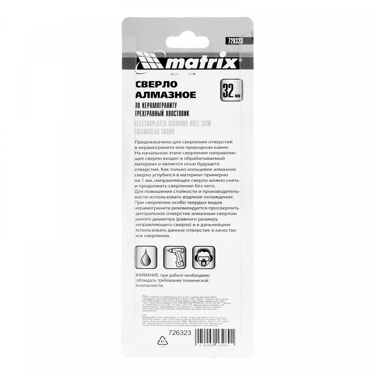 Сверло алмазное по керамограниту, 32 х 67 мм, трехгранный хвостовик Matrix