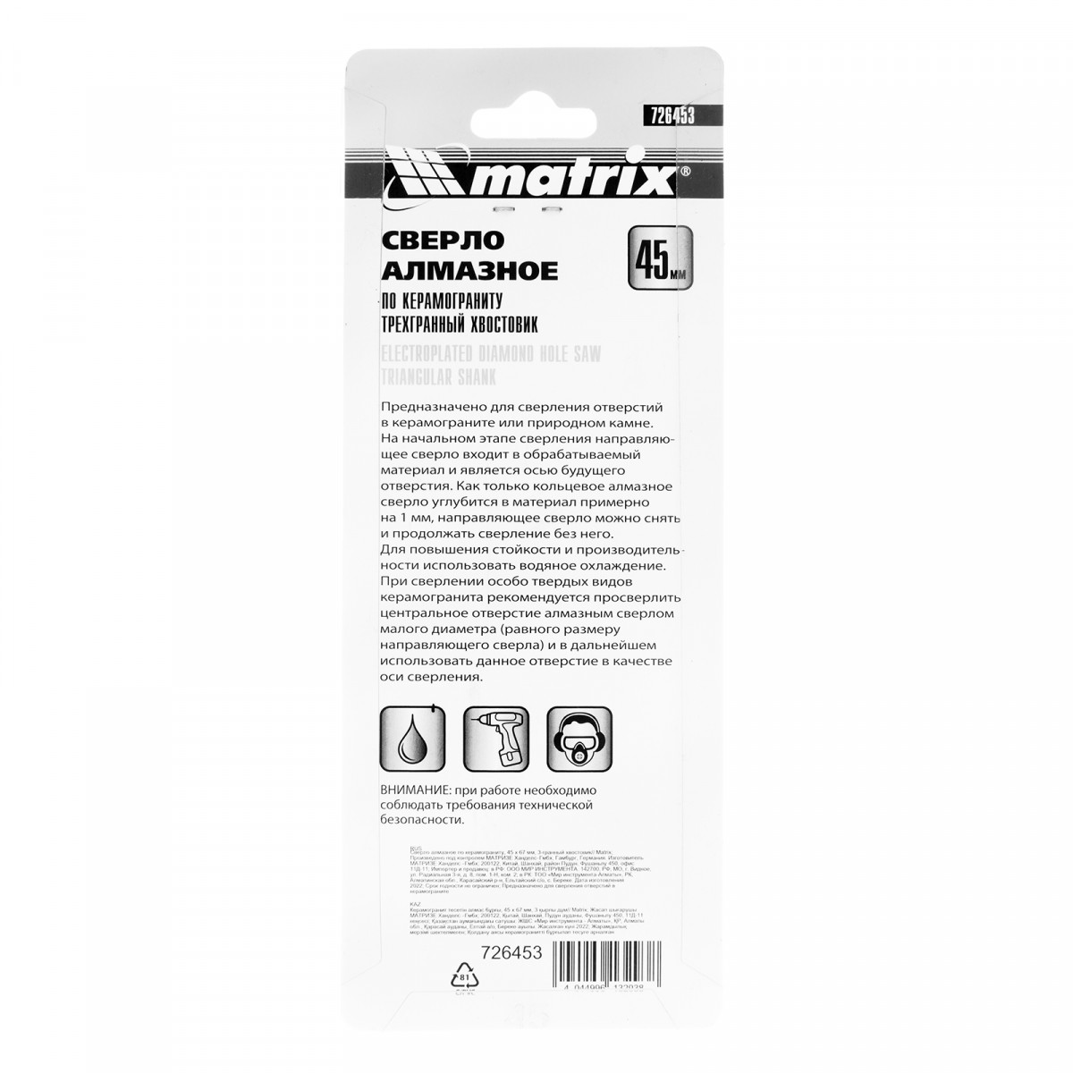 Сверло алмазное по керамограниту, 45 х 67 мм, трехгранный хвостовик Matrix