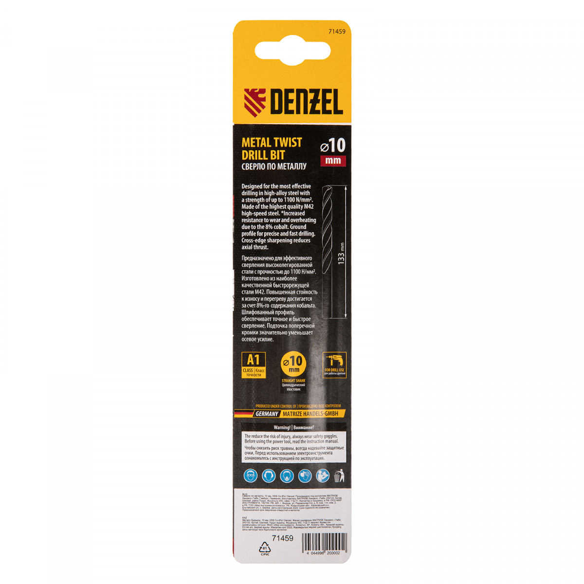 Кобальтовое сверло по металлу Denzel 71459 диаметром 10 мм, из стали HSS Co-8%, позволяет получать отверстия высокой точности в нержавеющей стали, цветных металлах, легированных и нелегированных сталях с пределом прочности до 1100 Н/мм2, а также в жестком пластике. Угол заточки 135° обеспечивает повышенную точность и чистоту сверления.