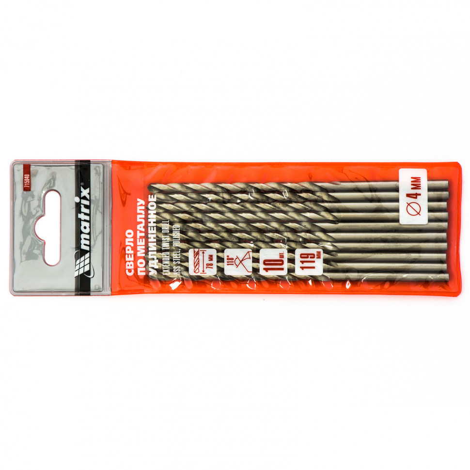 Сверло по металлу, 4 х 119 мм, полированное, удл, HSS, 10 шт, цилиндрический хвостовик Matrix