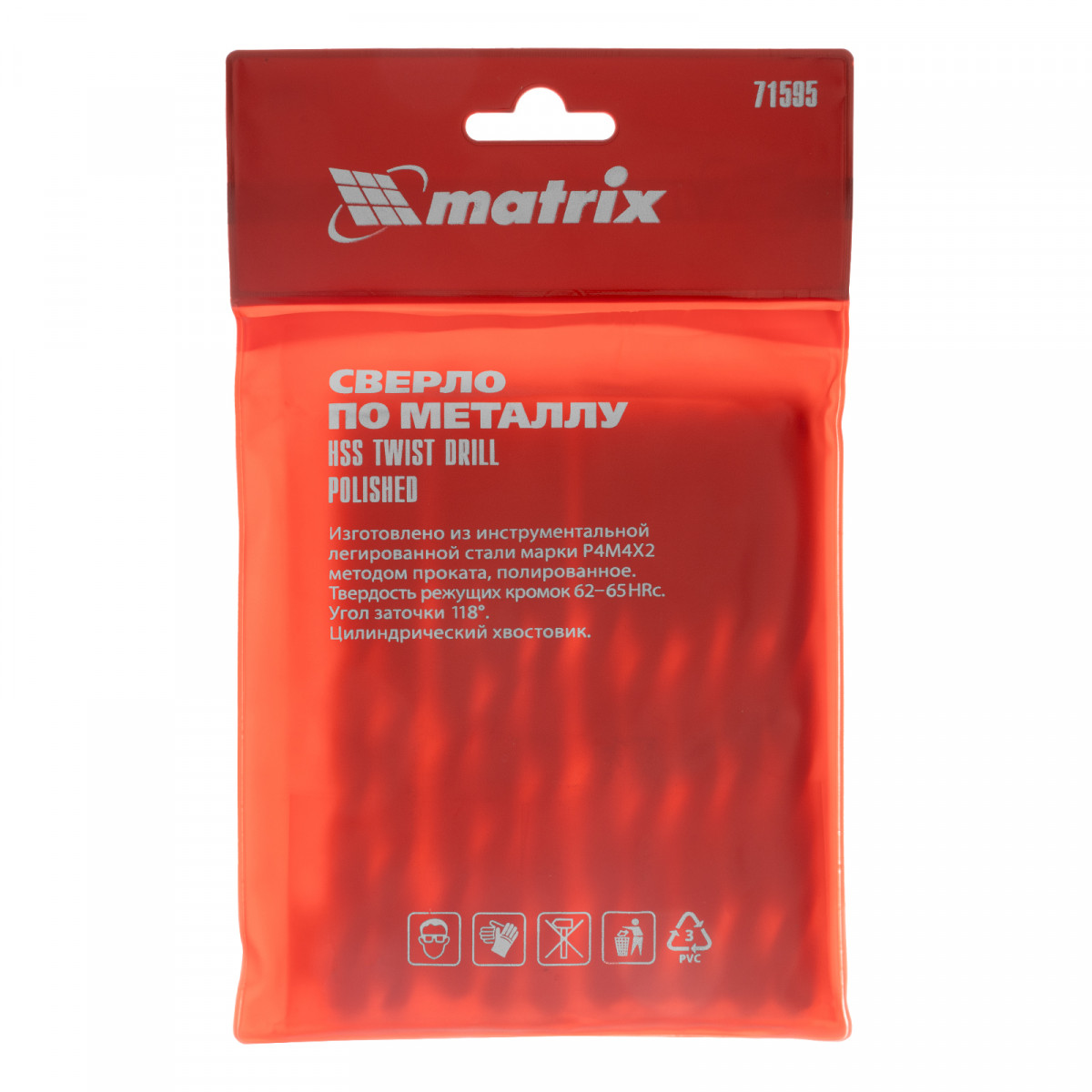 Полированное сверло по металлу Matrix 71595 из стали HSS, с цилиндрическим хвостовиком, 10 шт. в упаковке, используется для получения отверстий диаметром 9,5 мм. Угол заточки составляет 118 градусов, поэтому сверло оптимально для работы с черными металлами, сталью, чугуном и твердой бронзой.
