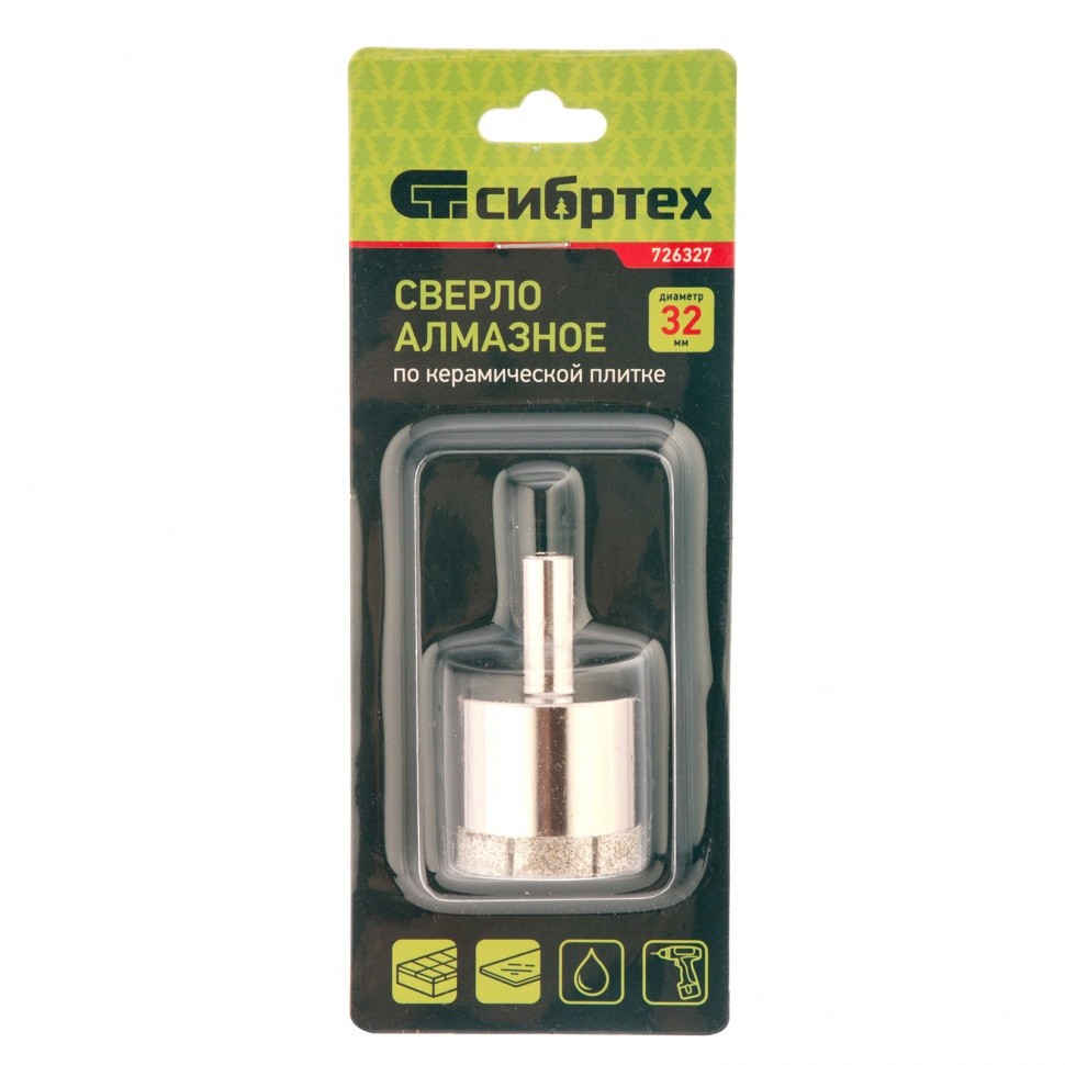 Сверло Сибртех 726327 размером 32 х 55 мм, с цилиндрическим хвостовиком, используется для получения ровных отверстий без сколов в стекле и керамической плитке. Устанавливается в патрон дрели или шуруповерта, работающих в диапазоне 350-700 об/мин. Во время работы рекомендуется применять водяное охлаждение — это существенно увеличит ресурс оснастки. Использование кондуктора (арт. 72830) позволяет точно позиционировать сверло и облегчает засверливание. Оснастка подходит для выполнения работ небольшого объема и рекомендована для использования в быту.