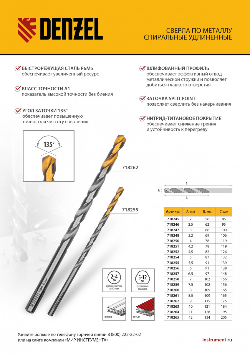 • Устойчивость к перегреву и динамическим нагрузкам — сверло изготовлено из высококачественной быстрорежущей стали твердостью 62-64 HRC.