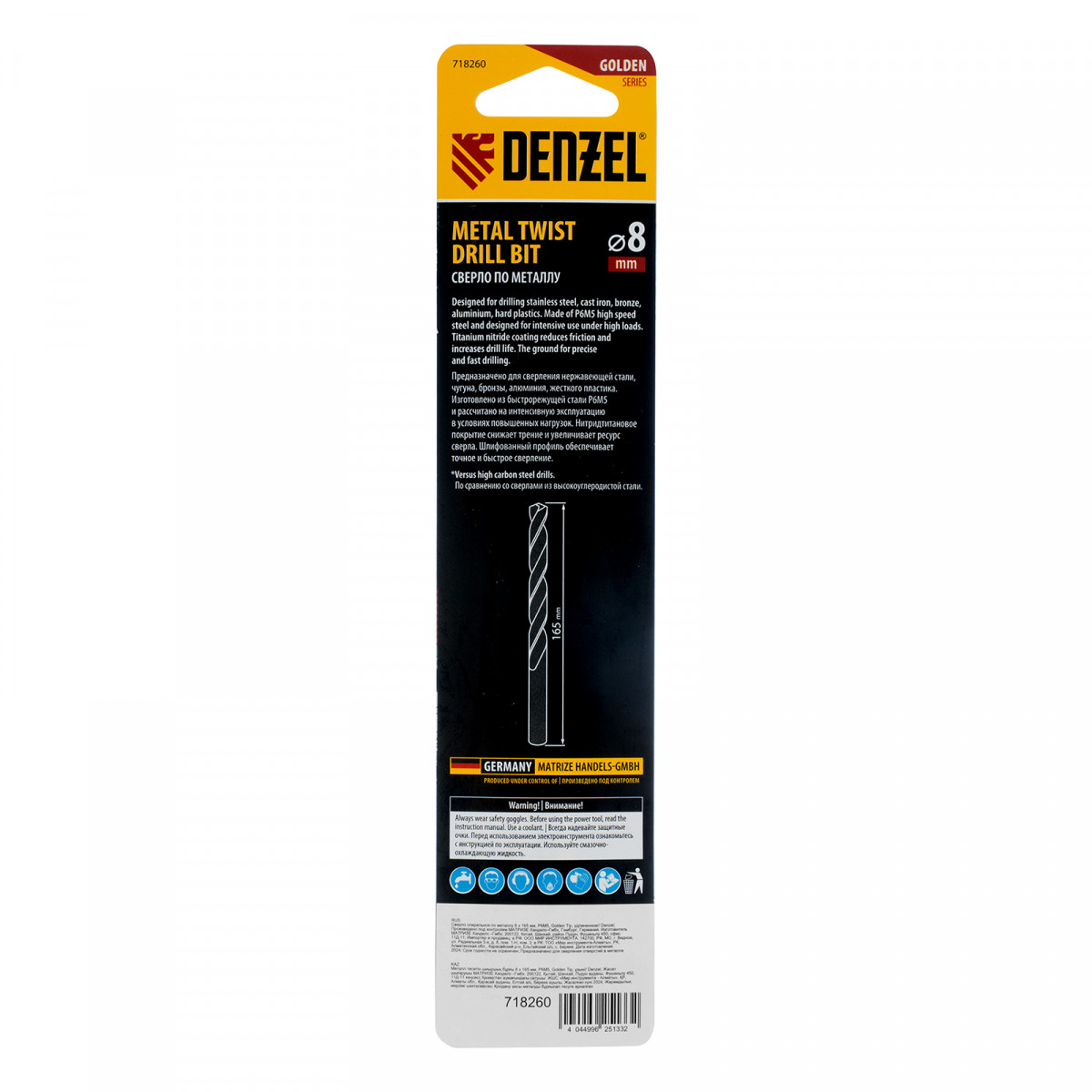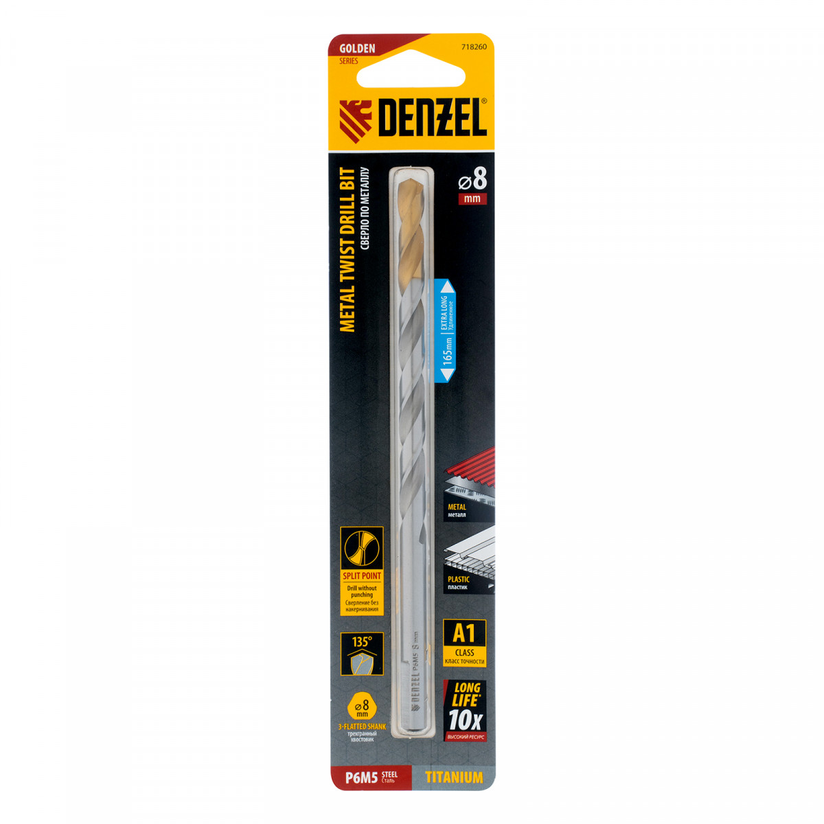 Сверло спиральное по металлу 8 х 165 мм, Р6М5, Golden Tip, удлиненное Denzel