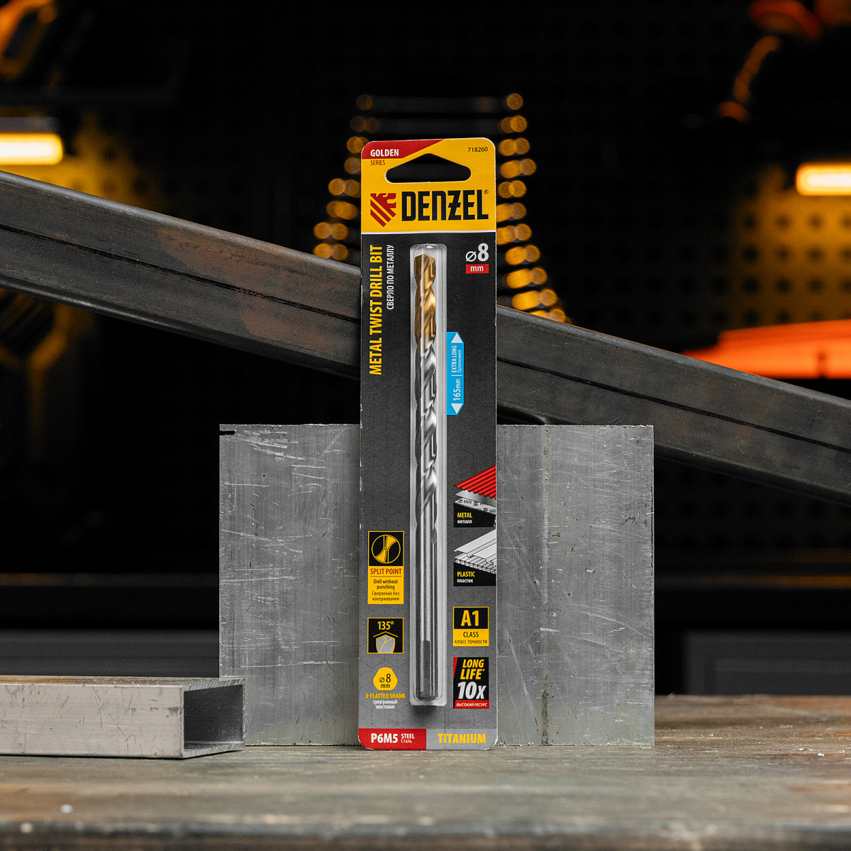 Удлиненное спиральное сверло по металлу Denzel Golden Tip 718260 из стали P6M5, размером 8 х 165 мм, предназначено для получения отверстий в легированных и цветных металлах — меди, алюминии, мягкой бронзе, титане, латуни. Оснастка позволяет эффективно справляться с этими задачами благодаря оптимальному углу заточки 135°. Класс точности A гарантирует высокое качество работ, а удлиненный профиль позволяет сверлить глубокие отверстия. Сверло используется для проведения монтажно-сборочных работ.