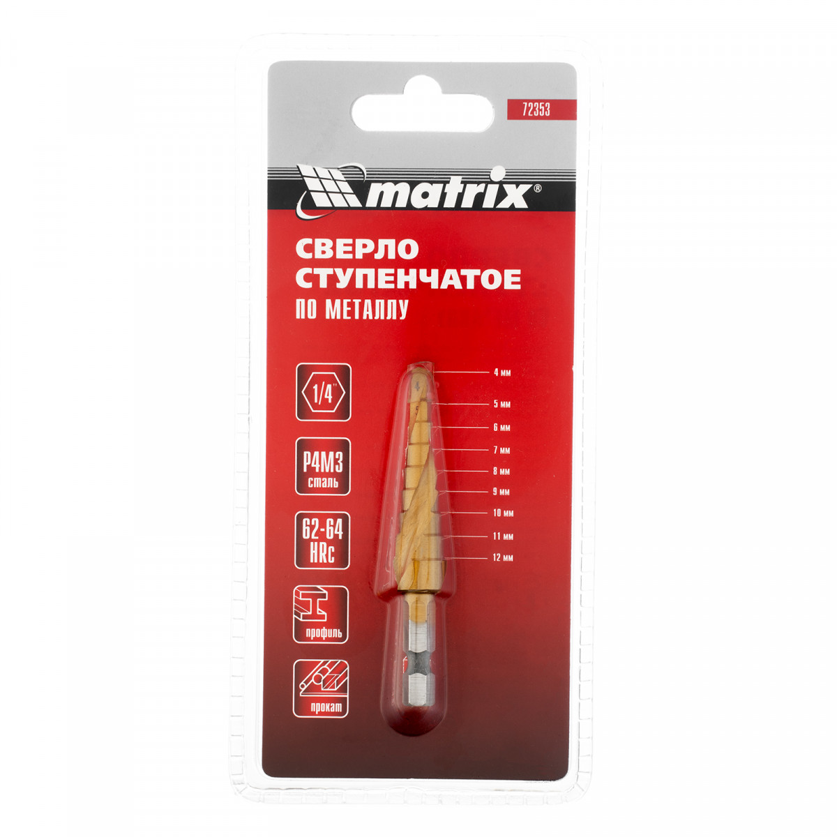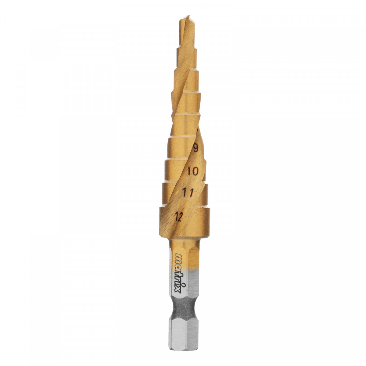 Сверло ступенчатое 4-5-6-7-8-9-10-11-12 мм, HSS, спиральный профиль, шестигранный хвостовик Matrix