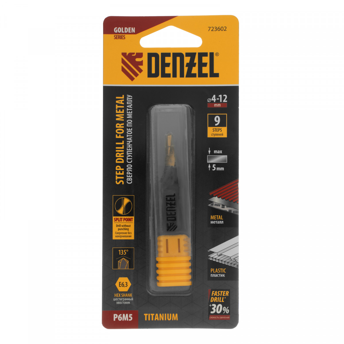 Сверло ступенчатое 4-5-6-7-8-9-10-11-12 мм, Р6М5, 6-гр. хвостовик Denzel