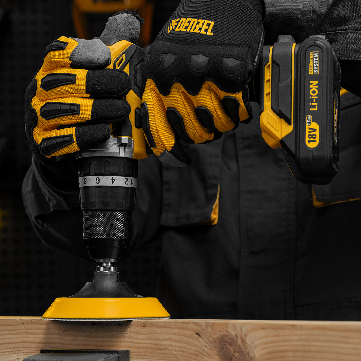 Тарелка опорная для дрели и УШМ с липучкой, 115 мм, мягкая, с адаптером c М14 на d8 Denzel