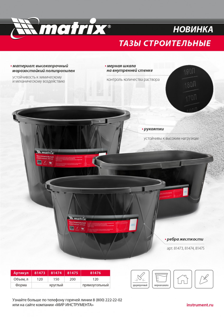 Круглый строительный ударопрочный таз Matrix 81475 с ребрами жесткости, объемом 200 л, универсален в применении: он используется для перемешивания строительных смесей, хранения сыпучих материалов и воды для технических нужд. Будет полезен во время проведения строительно-отделочных работ, пригодится также в подсобном хозяйстве и на огороде.