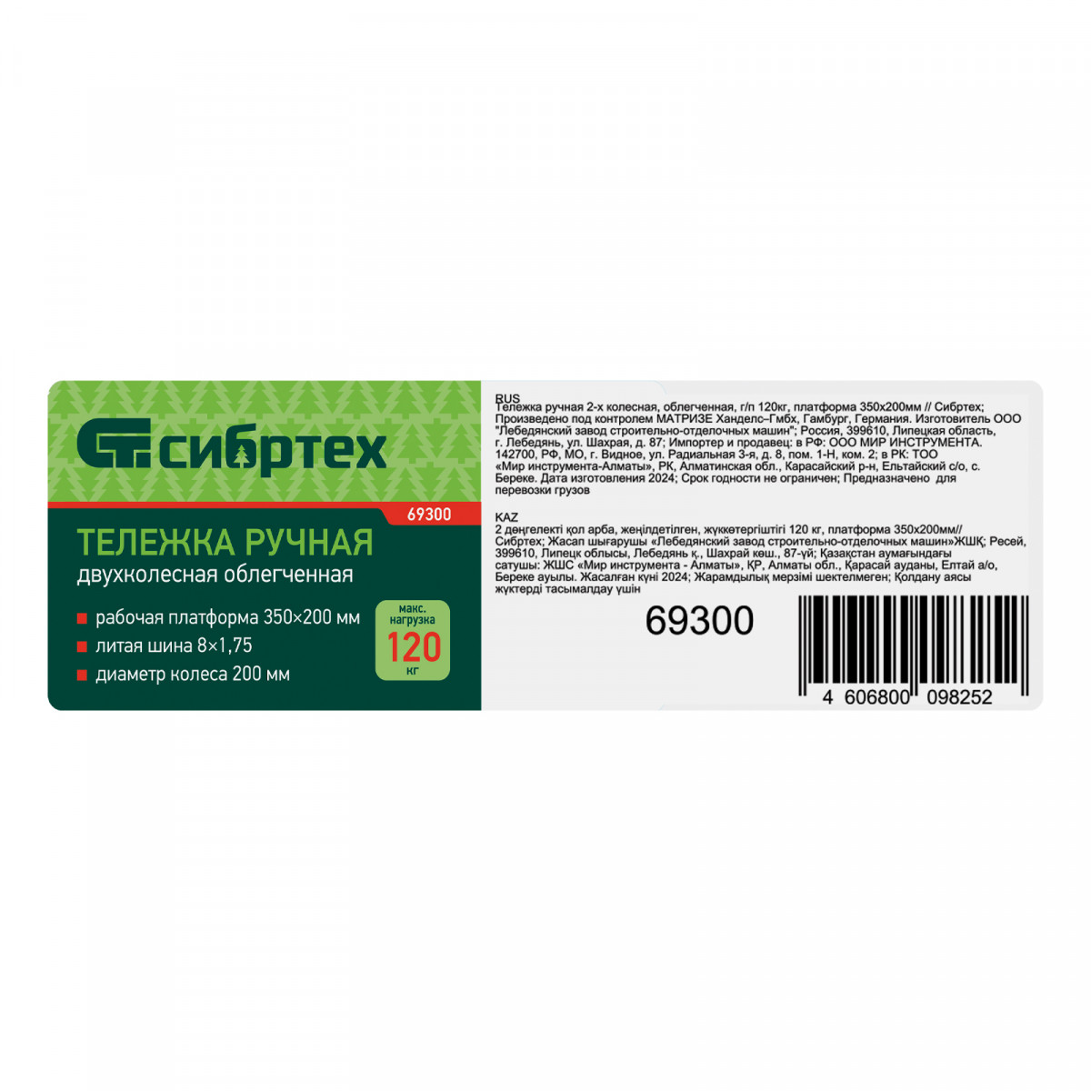 Тележка ручная 2-х колесная, облегченная, г/п 120кг, платформа 350х200мм Сибртех