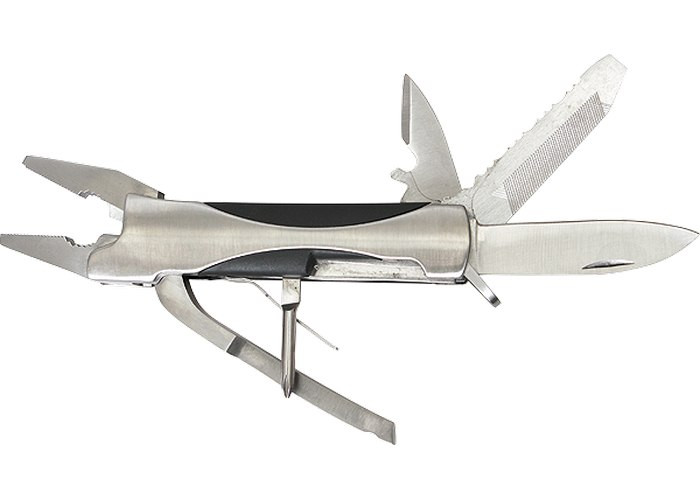 Универсальный инструмент-трансформер для домашнего применения. В комплект входят: пассатижи, отвертки крестовая и шлицевая, консервный нож, нож с пилкой, большой нож.